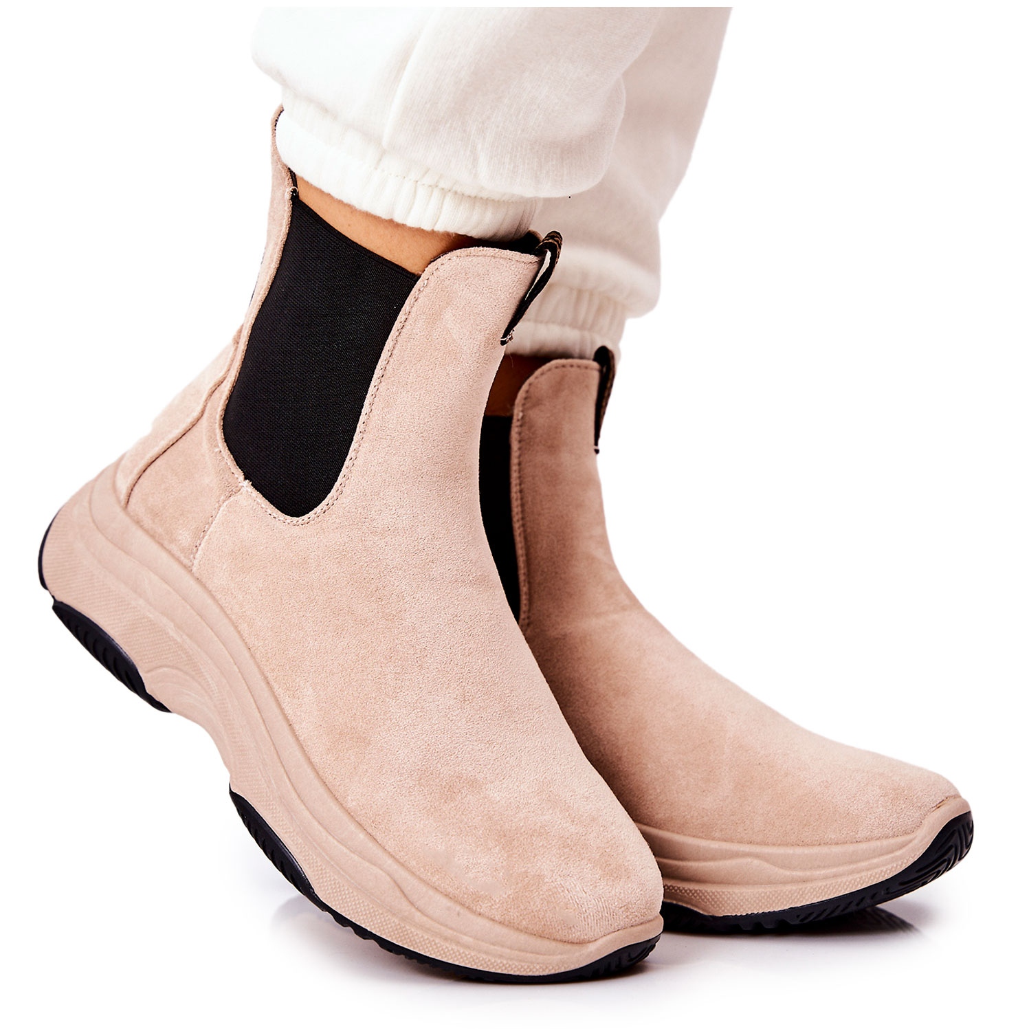 WS1 plattformsstövlar av eko-mocka i beige är det perfekta valet för höst- och vintersäsongen för alla älskare av fashionabla skor. Tillverkade av mjukt material som är behagligt att röra vid, garanterar de komfort att bära hela dagen. Ett intressant element är de praktiska muddarna på ovandelen, som gör att du kan anpassa den till bredden på ditt ben, vilket ökar användarkomforten.