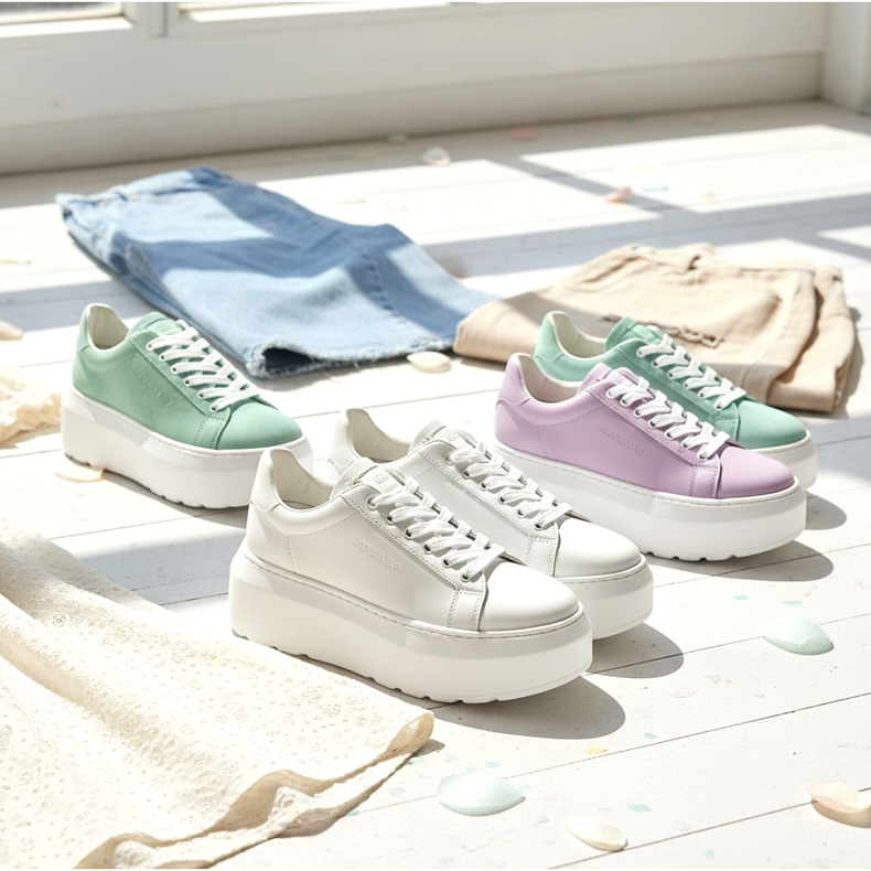 Vita och krämfärger dominerar, men pastellfärgade plattformssneakers dyker också upp allt oftare - mint, puderrosa och lavendel. Detta är ett bra alternativ för människor som letar efter skor som är både moderiktiga och uttrycksfulla.