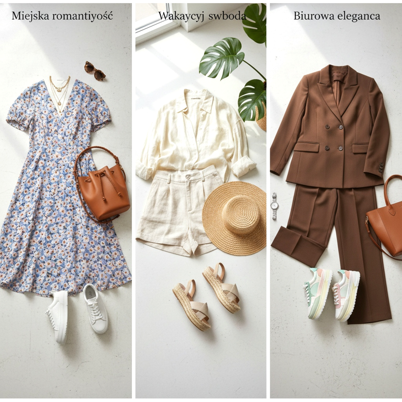 Look 1: Urban romantik — blommig midiklänning + vita platåsneakers + bucketväska i naturligt brunt läder. Lägg till känsliga smycken och solglasögon.
