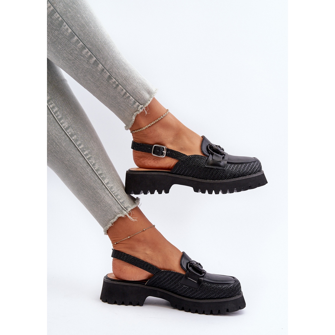 Den justerbara remmen på baksidan med spännet möjliggör individuell passning till foten, vilket ytterligare ökar användningen av användningen. Det inre av skor som är avslutat med naturligt läder garanterar nöjet att bära, och deras minimalistiska snitt gör dem universella och matchar olika sommarkläder.