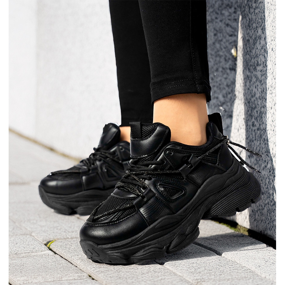 Klämma för snören garanterar en perfekt passform, och en platt sula säkerställer stabilitet och komfort under alla aktiviteter. Kvinnors sneakers på den svarta plattformen är det perfekta valet dagligen och för träning, vilket inte bara kommer att vara praktiskt utan också fashionabla.