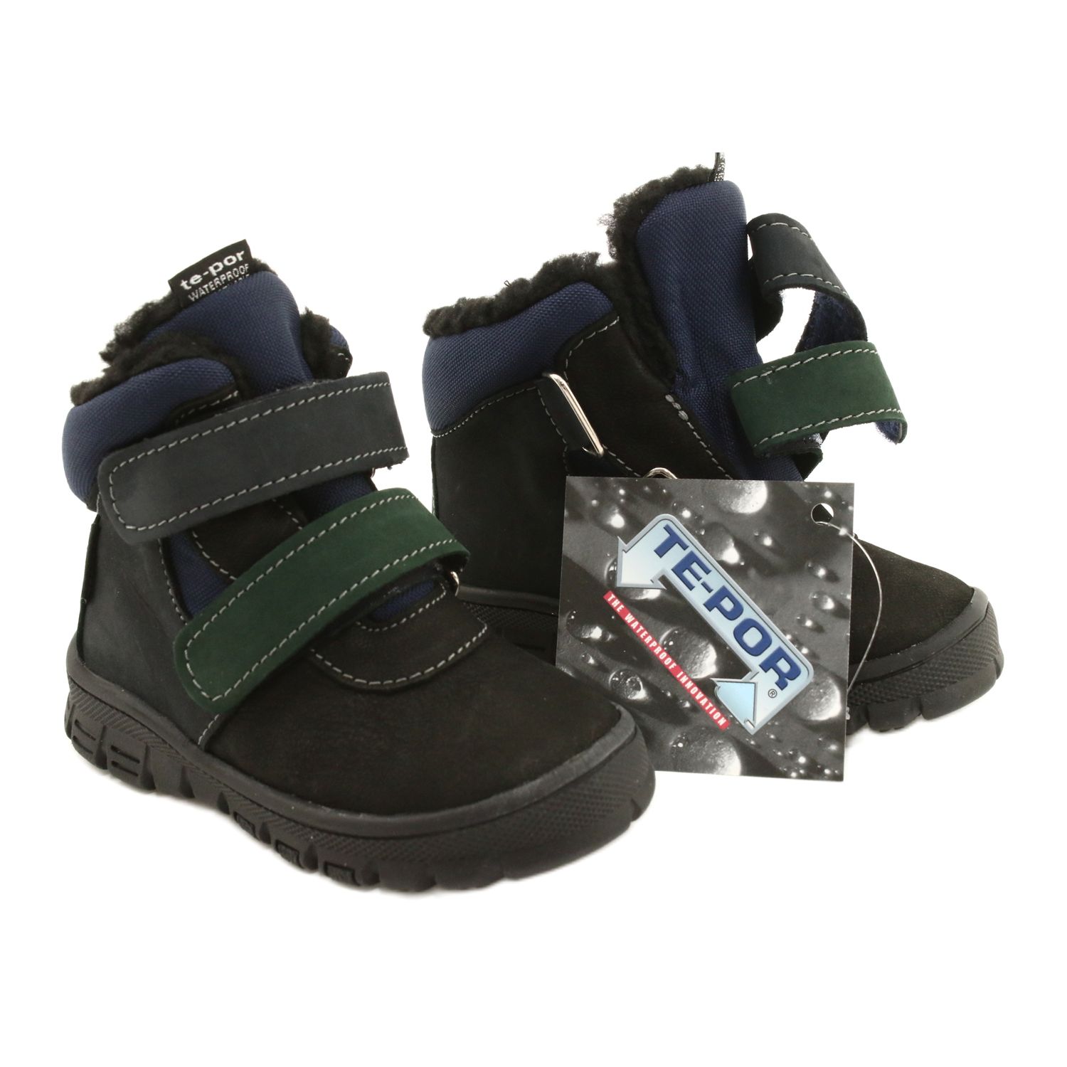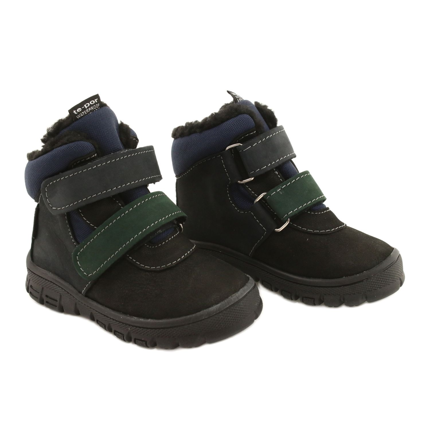 Praktiska och solida stövlar för en pojke som kombinerar naturlig hud med hållbart material. Utrustad med TE-POR (vattentät) membran, tack vare vilka skorna är vattentäta perfekt för vinterutgångar och spel utanför. Interiören isolerad med mjuk päls ger värme, och den styvade hälen stabiliserar och skyddar barnets fotled.