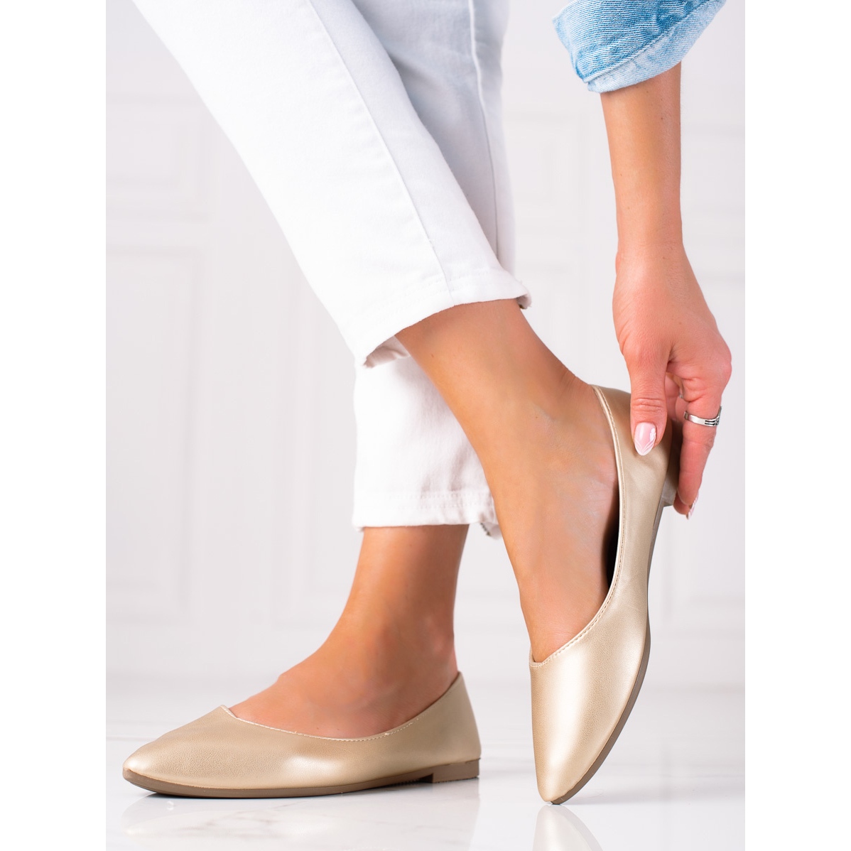 Potockis balettlägenheter är gjorda av högkvalitativt ekologiskt läder och utmärks av sin metalliska guldfärg, som attraherar ögat och ger glans till alla stylingar. En mjuk, inbyggd häl säkerställer stabilitet och komfort att bära, och de mandelformade tårna ger subtil charm. Innersulan i naturligt läder garanterar komfort även under hela dagen.