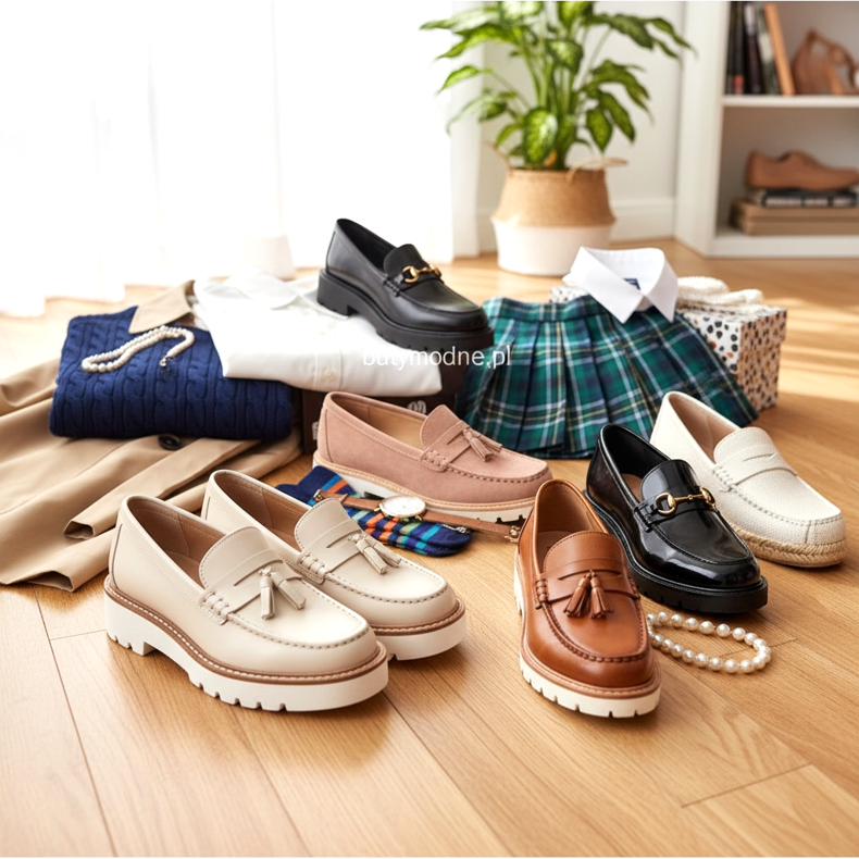 Särskilt populära den här säsongen är loafers med en dekorativ rem eller ben vid nosen (så kallade bit loafers), som ger karaktär till skorna. Modeller med tjock sula eller plattform blir också mer och mer populära, vilket ger dem ett mer modernt, urbant utseende. de är snygga med jeans upprullade vid ankeln och en tröja kavaj eller med en klassisk midikjol med veck.