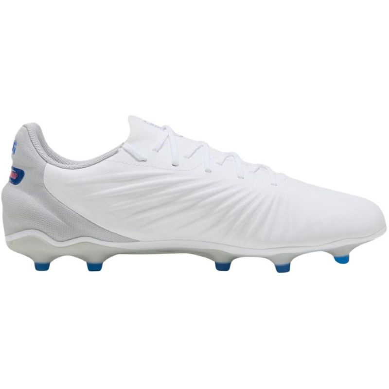 Puma King Match FG/AG kännetecknas inte bara av funktionalitet, utan också en unik, vit färg med blå accenter, vilket ger dem en sportig och elegant utseende. Sulan har utformats för optimal kontakt med ytan, vilket garanterar stort grepp och ökar säkerheten under dynamiska rörelser på planen.