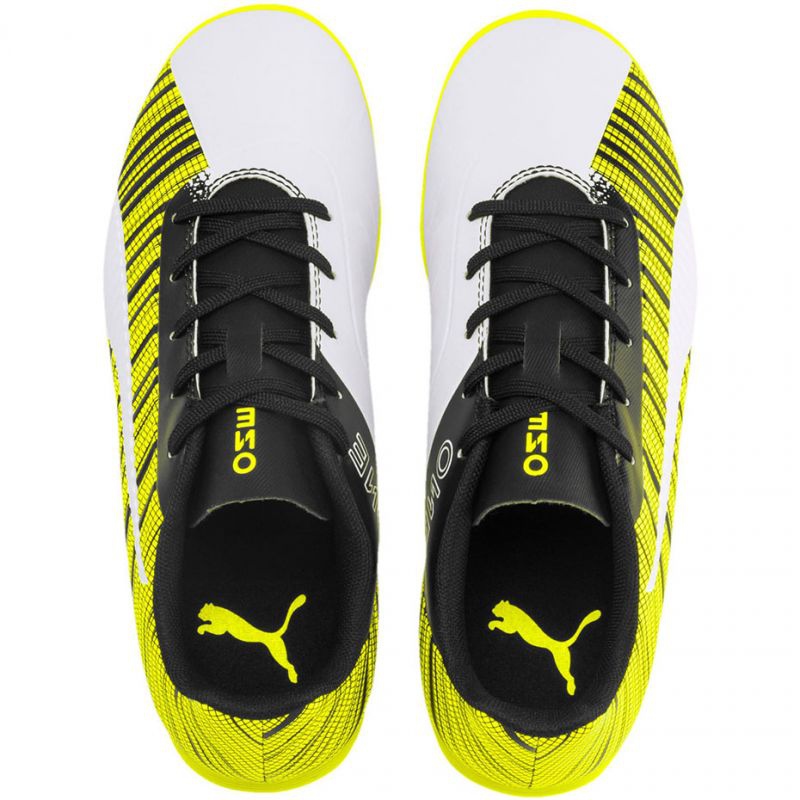 Puma One 5.4 IT Jr 105664 04 fotbollsskor är det perfekta valet för unga idrottare som vill utveckla sina färdigheter på inomhusplanen. En del av den senaste Puma Rush Pas-kollektionen, dessa mångfärgade skor i nyanser av gult, vitt och svart ger inte bara ett snyggt utseende, utan också komforten och stödet som är avgörande under intensiva matcher.