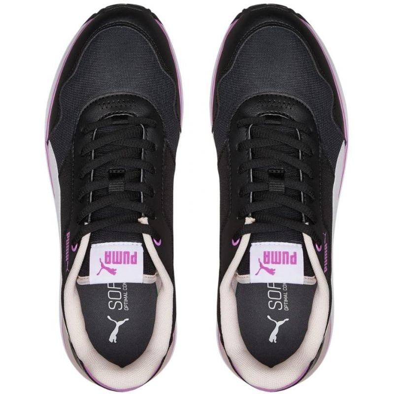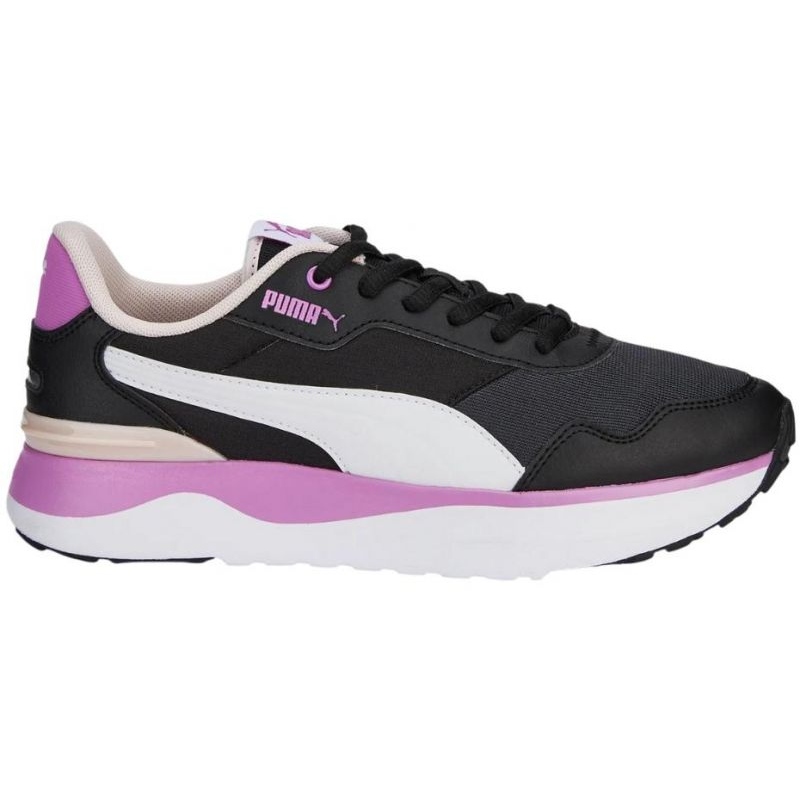 Skorna finns i en fashionabel kombination av vita, svarta och lila färger, vilket gör att de passar perfekt till olika stilar. Tack vare sin unika design skiljer sig Puma R78 Voyage-skor från andra modeller och utgör inte bara ett praktiskt inslag i kläderna, utan också ett moderiktigt tillbehör.