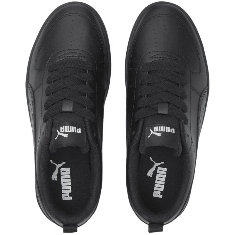 Skorna är utrustade med en gummisula med ett icke-märksystem, vilket gör att de inte lämnar märken på golvet, vilket gör dem till ett idealiskt val för inomhusbruk. Tack vare deras universella svarta färg kan Puma Rickie Jr-skor enkelt kombineras med olika stilar, både sportiga och vardagliga.