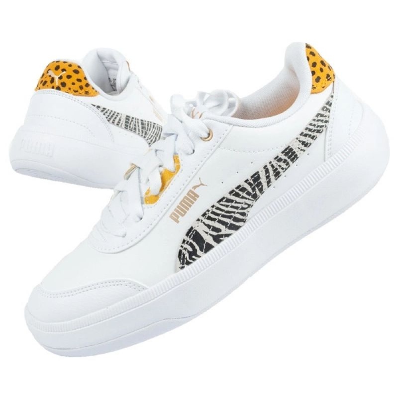 Moderna, bekväma och eleganta kvinnors skor Puma Tori Safari är ett idealiskt förslag dagligen. Klassiska, låga sneakers med en universell, vit färg med ett subtilt djurmönster som tillför karaktären av alla stilisering. Modellen kombinerar urban estetik med komfort tack vare softfoam -teknik.