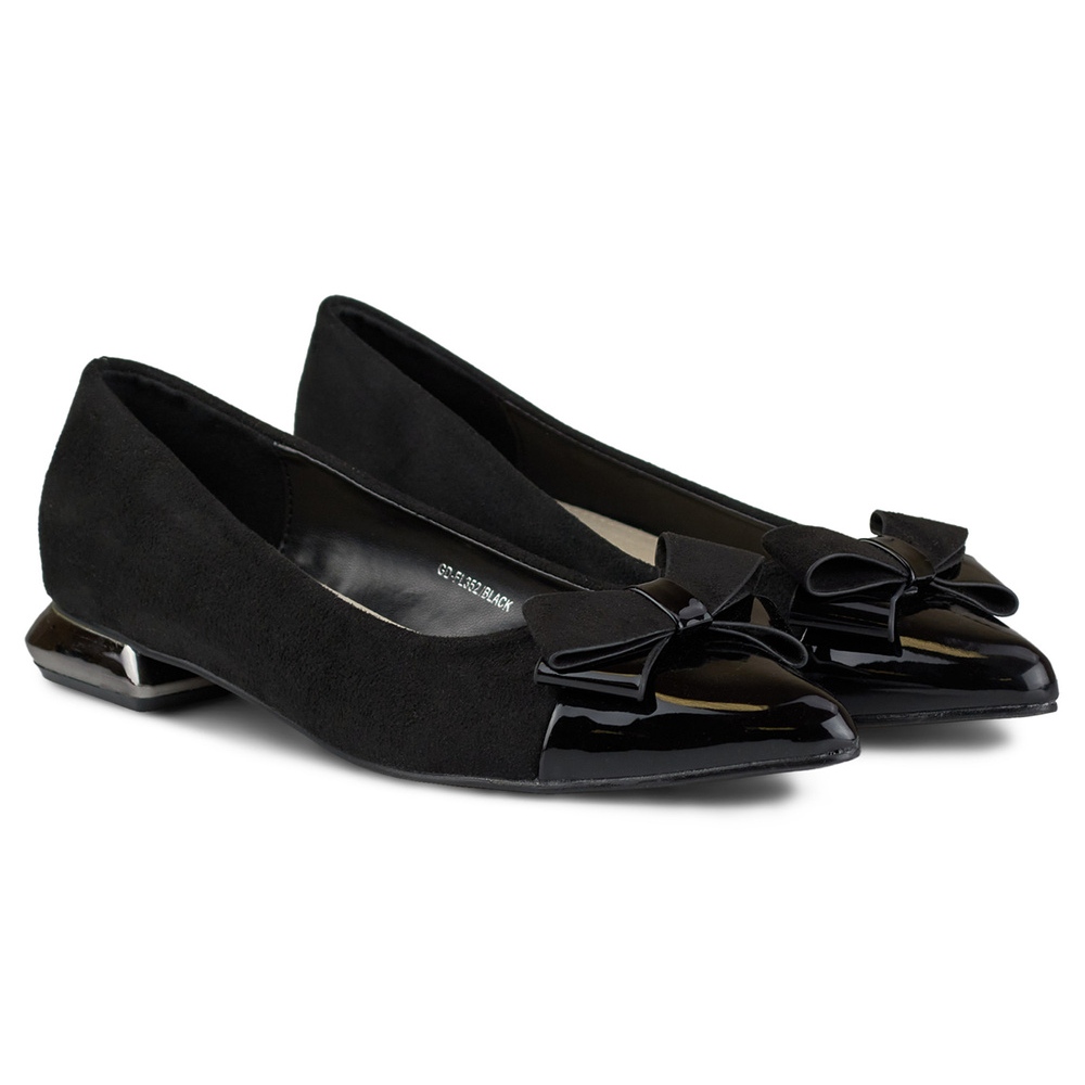 Pumps med rosett på en låg silverhäl är det perfekta valet för varje kvinna som värdesätter elegans i kombination med komfort. Tillverkade av högkvalitativ ekologisk mocka och ekologiskt patentläder, kommer dessa svarta skor att lägga klass till varje styling.