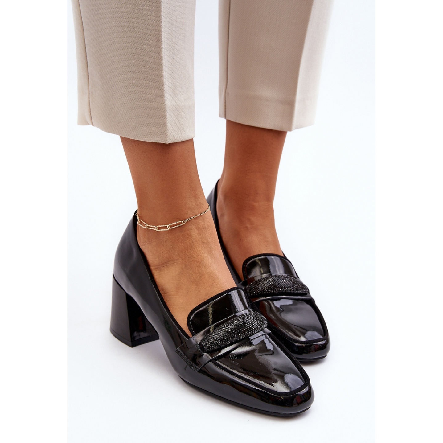 Pumparna har en låg 6,5 cm hög stolpe, vilket ger dem elegans och gör dem till ett perfekt komplement till både vardagliga och mer formella stiliseringar. Den unika dekorationen på framsidan av den övre ger dem en unik karaktär, lockar deras ögon och betonar den fashionabla stilen.
