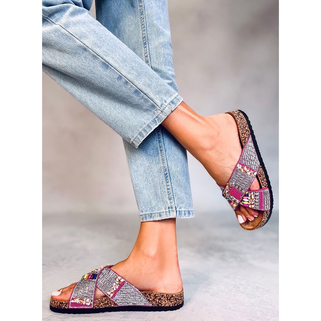 Upptäck sommarklassiker med fuchsia PA1 flipflops! Dessa damflipflops med korksula kombinerar ledighet med moderiktig stil. Deras unika design väcker uppmärksamhet tack vare färgglada pärlor och glänsande zirkoner som ger dem en etnisk karaktär. De är perfekta för långa sommarpromenader eftersom de har en perfekt profilerad innerinsats täckt med mjukt tyg, vilket säkerställer bärkomfort hela dagen.