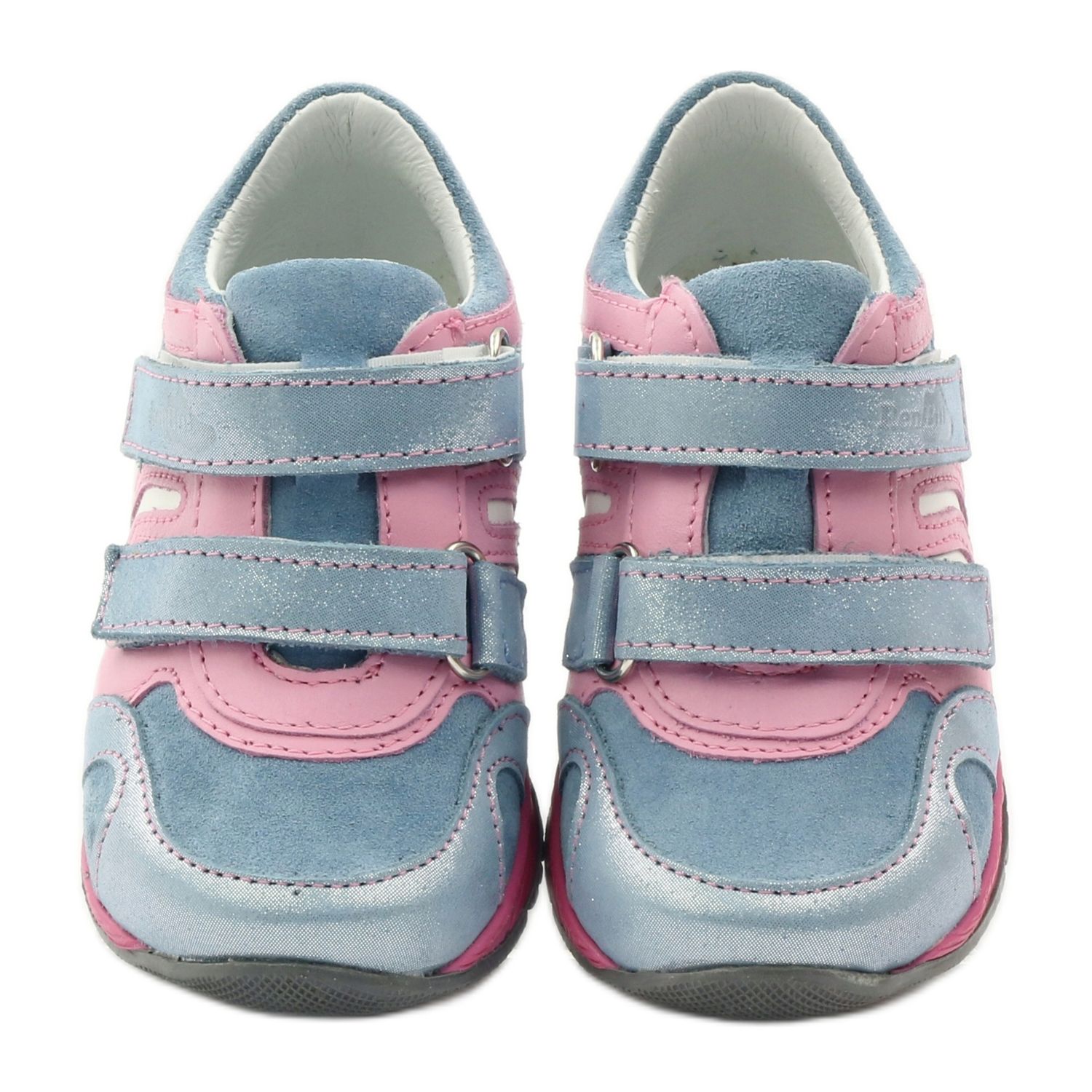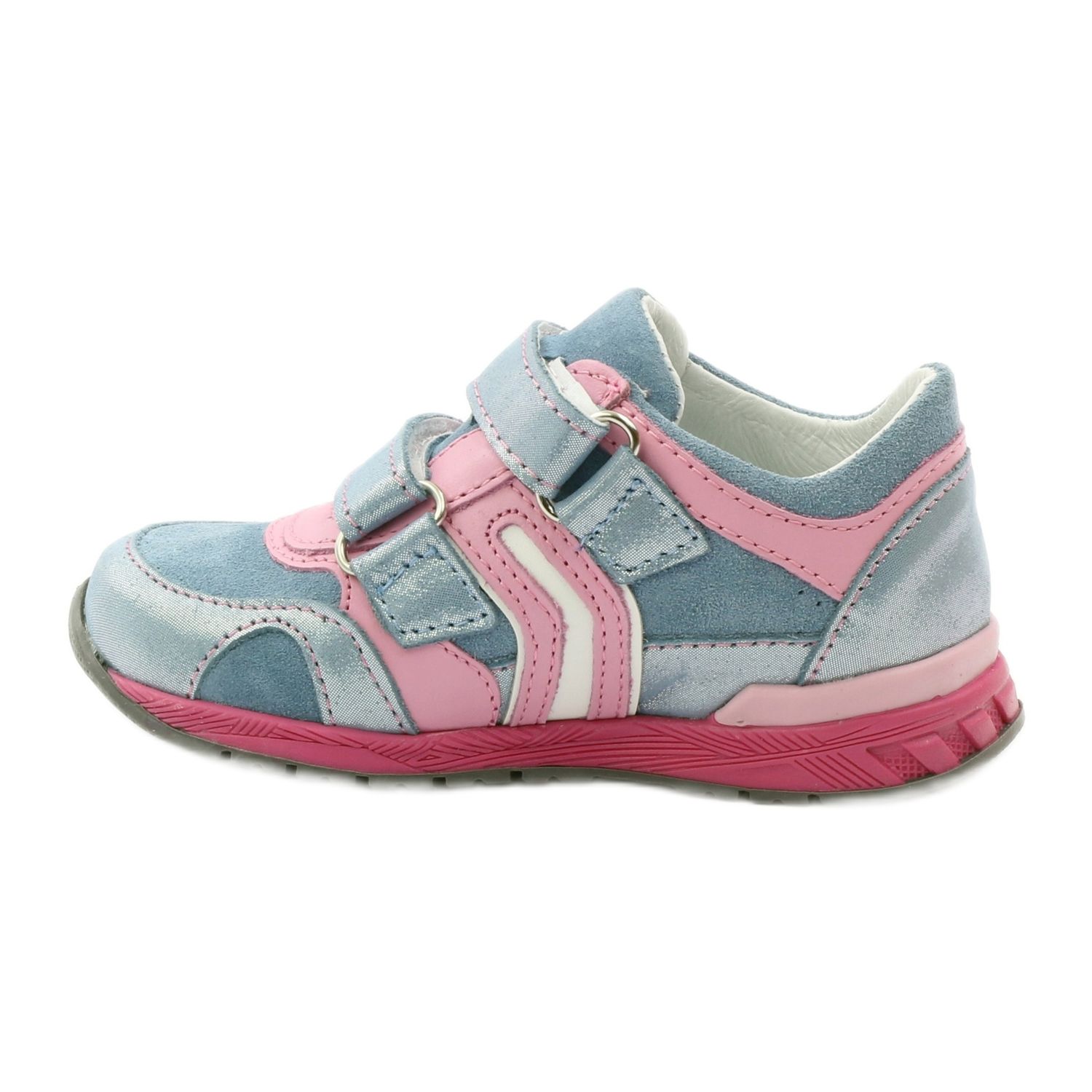 Snygga och bekväma skor för tjejer som kombinerar känsliga, pastellfärger med funktionella lösningar. Ovandelen är gjord av mjukt, naturligt läder i nyanser av blått, ljusrosa och vitt med glänsande accenter. Två breda, blå kardborreband gör det lättare att ta på och exakt anpassa skon efter foten, och den styva hälen ger tillräcklig stabilisering under gång.