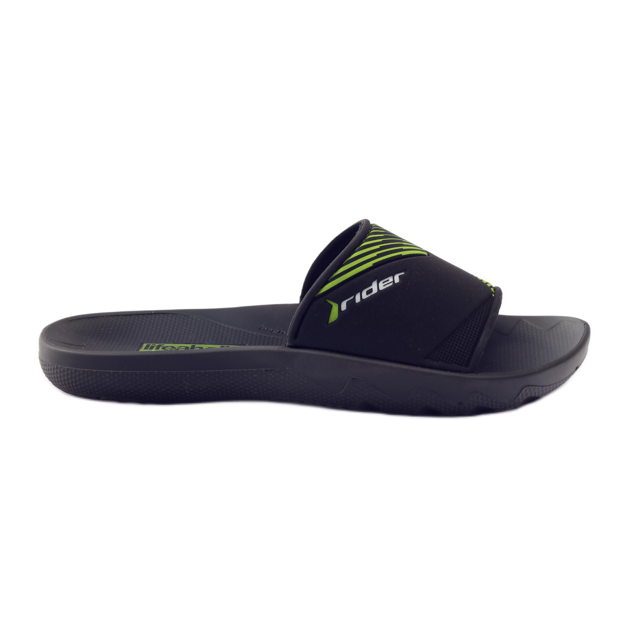 Rider 82325 poolflipflops är ett utmärkt val för män som letar efter bekväma skor för sommardagar. De har en modern svart design med attraktiva gröna ränder som ger fräschör och stil.