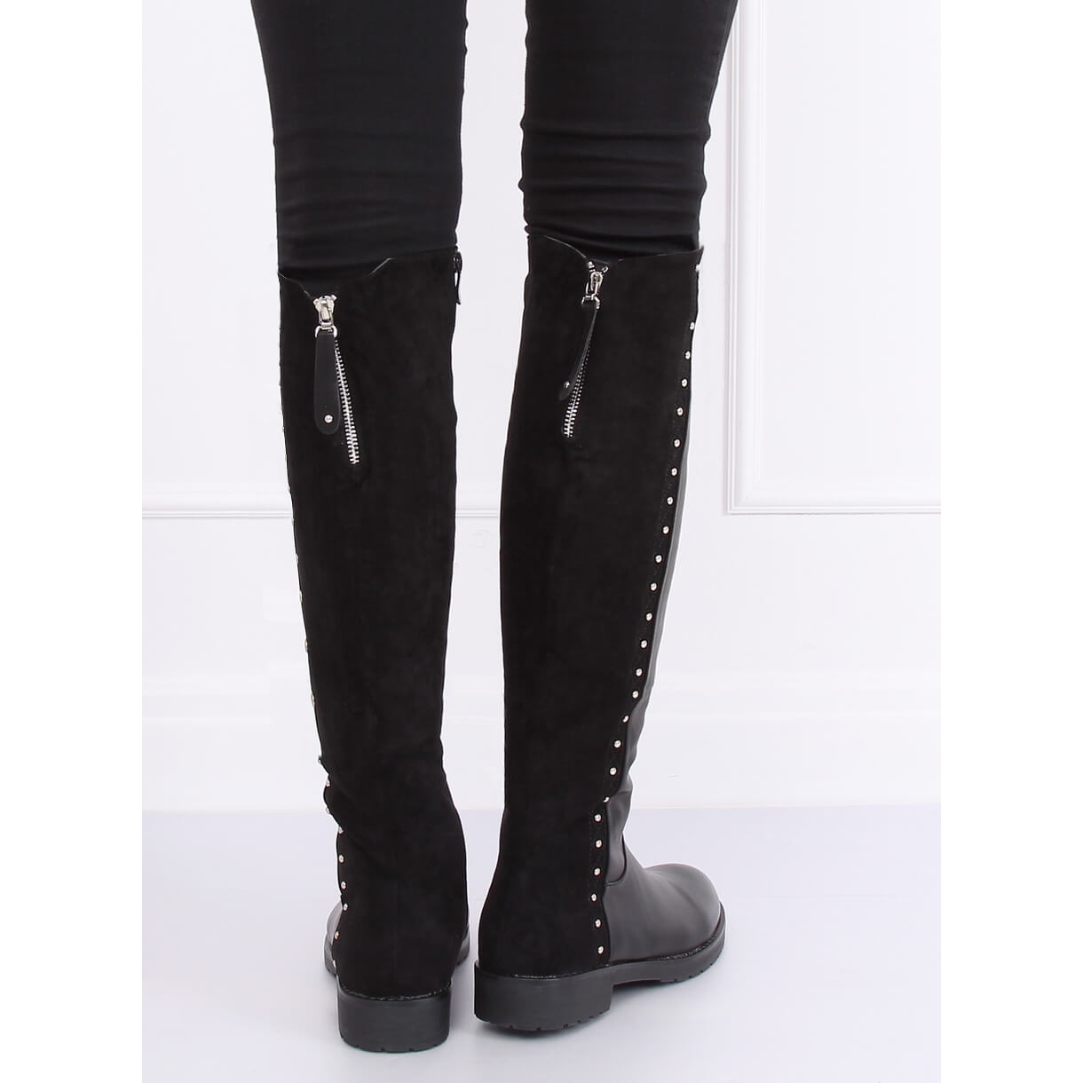 Deras klassiska svarta färg gör att de matchar perfekt med olika stilar - från avslappnad till mer elegant. Den höga ovandelen som sträcker sig upp till knäet, dekorerad med iögonfallande nitar och strass, ger skorna en distinkt karaktär och gör att de sticker ut i mängden.