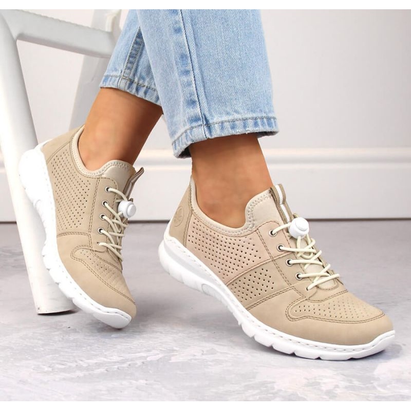 Riekerskor är tillverkade av högkvalitativa syntetiska läder och tyger och kännetecknas av hållbarhet och lätthet. Beige färg går perfekt med många stiliseringar, och den vita sulan ger dem en modern karaktär. En rund näsa och en låg finish gör att skorna inte bara är snygga, utan också bekväma att bära.