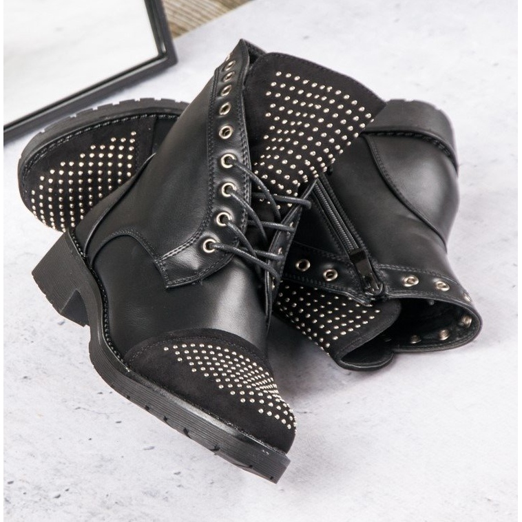 Svarta rockarbetare är det perfekta valet för självsäkra kvinnor som vill kombinera en moderiktig look med vardagskomfort. Dessa ankelboots är gjorda med känsla för detaljer och är dekorerade med spektakulära kristaller och strass som ger dem en unik karaktär.