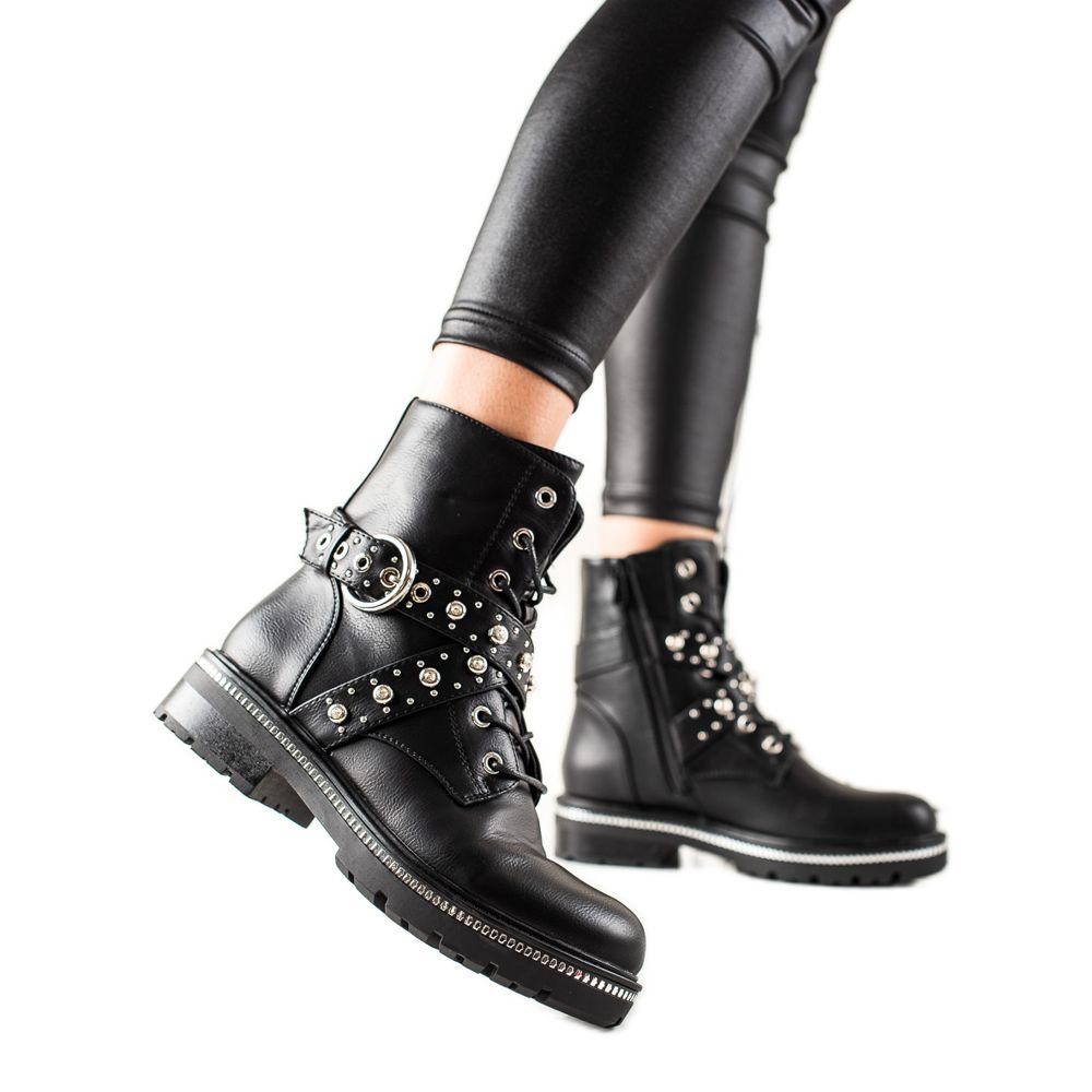 Karakteristiska strass och ett dekorativt spänne ger dem ett original, rockigt utseende, vilket gör dem till en perfekt passform för avslappnad stil. Designade för höst/vintersäsongen är de det perfekta komplementet till vardagsstyling, både med byxor och kjolar.