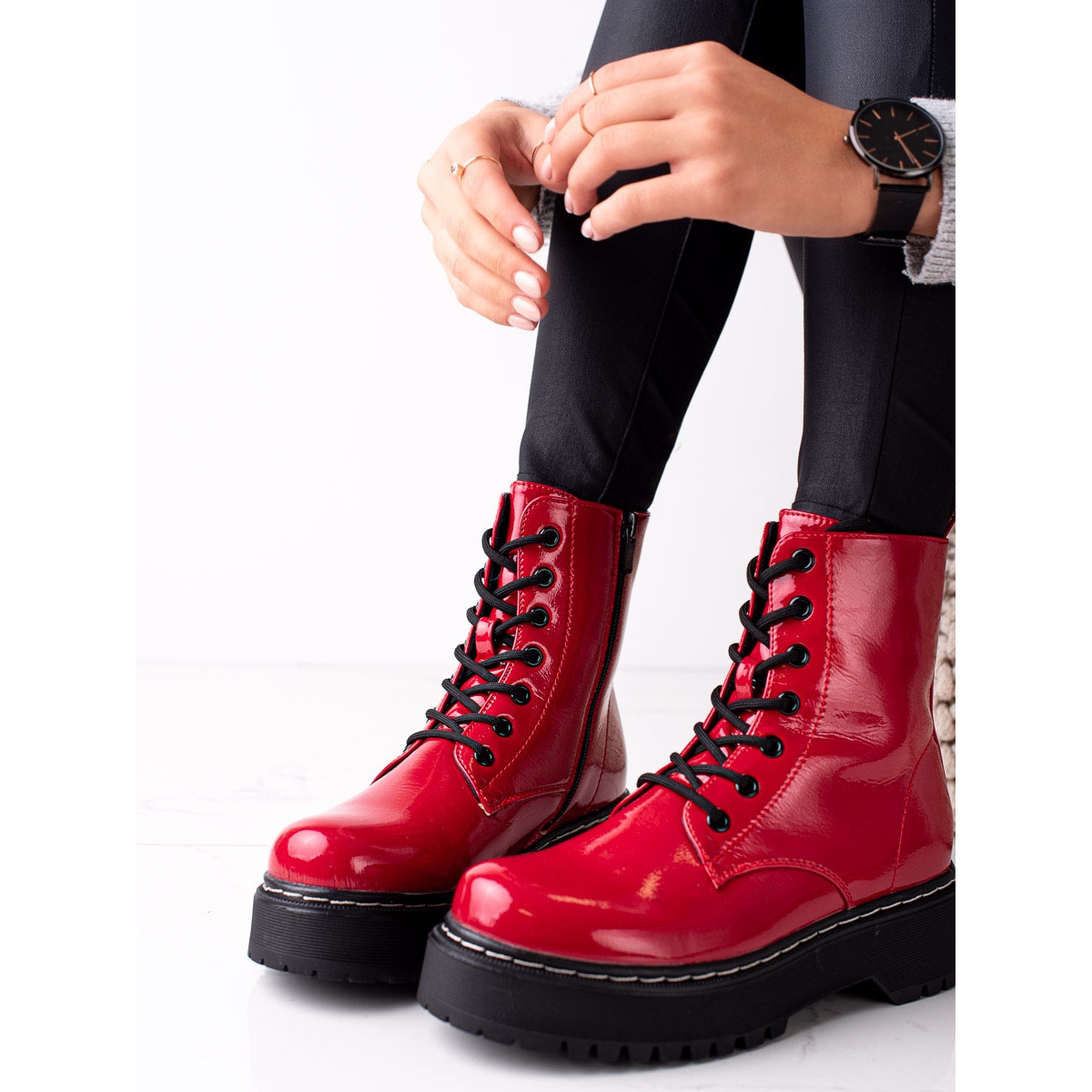 Den övre höjden på 15 cm gör att stövlarna når över ankeln, vilket dessutom skyddar fötterna och håller dem varma. Dragkedjan och snörning gör den lätt att ta på och anpassa efter foten. Den röda färgen ger dem uttrycksfullhet och gör dem till en perfekt accent i alla stylingar.