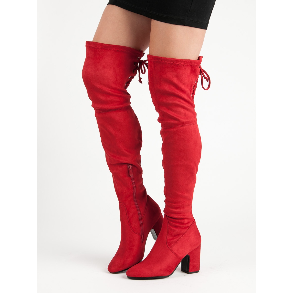 Detaljer: Super Me Röda lårhöga stövlar på ett inlägg