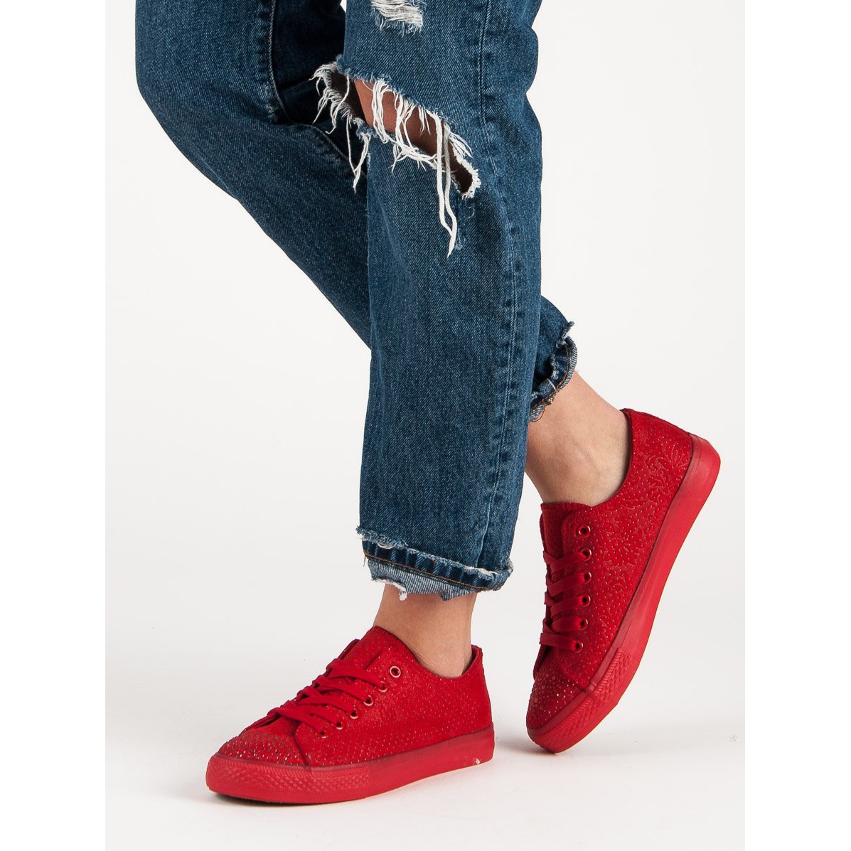 Sport Red Sneakers With Crystals är ett idealiskt förslag för kvinnor som vill lägga till lite färg och glans till sin vardagliga styling. Den intensiva röda som de är gjorda i livar perfekt upp alla casual outfits, och tillägget av moderiktiga kristaller på tån gör att dessa sneakers sticker ut från standardmodeller.