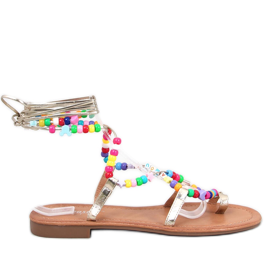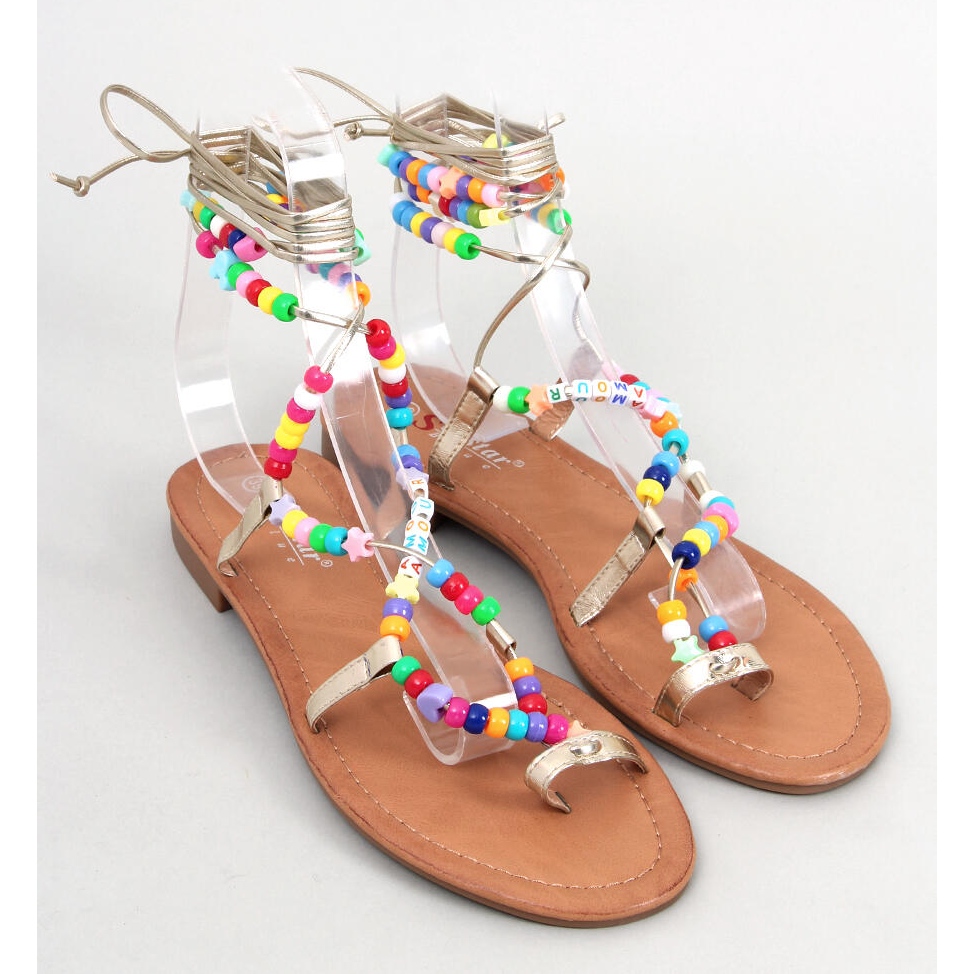 Upptäck unika BM Roman-sandaler för kvinnor med Megh Gold-pärlor i en ovanlig gyllene färg! Dessa iögonfallande romerska skor med platt sula är ett måste i varje sommargarderob.