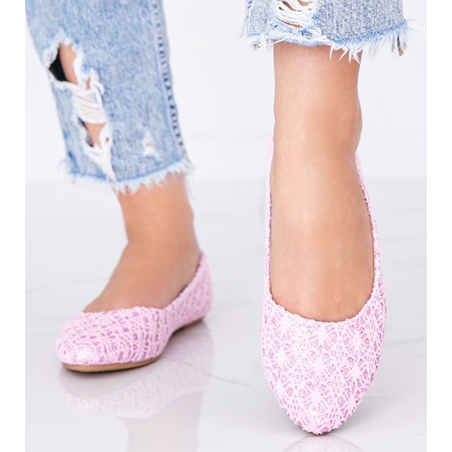 Den övre delen av ballerinaskorna är ett hantverk, gjord av högkvalitativt tyg, dekorerad med intrikata spetsar. Den eleganta detaljen ger dem utan tvekan en romantisk karaktär, och den rosa färgen, som överensstämmer med tillverkarens namn "Pink", gör skorna perfekta för vår- och sommardagar.