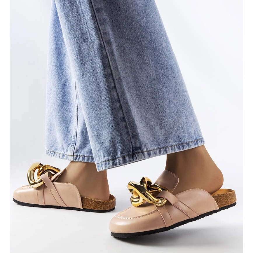 Christelle Flip Flops kombinerar fashionabla design med praktiska lösningar - en mjuk, mocka insats bryr sig om komfort, en gummisula med bra grepp och en liten plattform (3 cm) modellerar subtilt silhuetten, inte belastar din fot. Den gyllene kedjan ger hela en elegant accent, tack vare vilken klaffarna kommer att fungera både när du går runt i staden och sommarmöten med vänner.