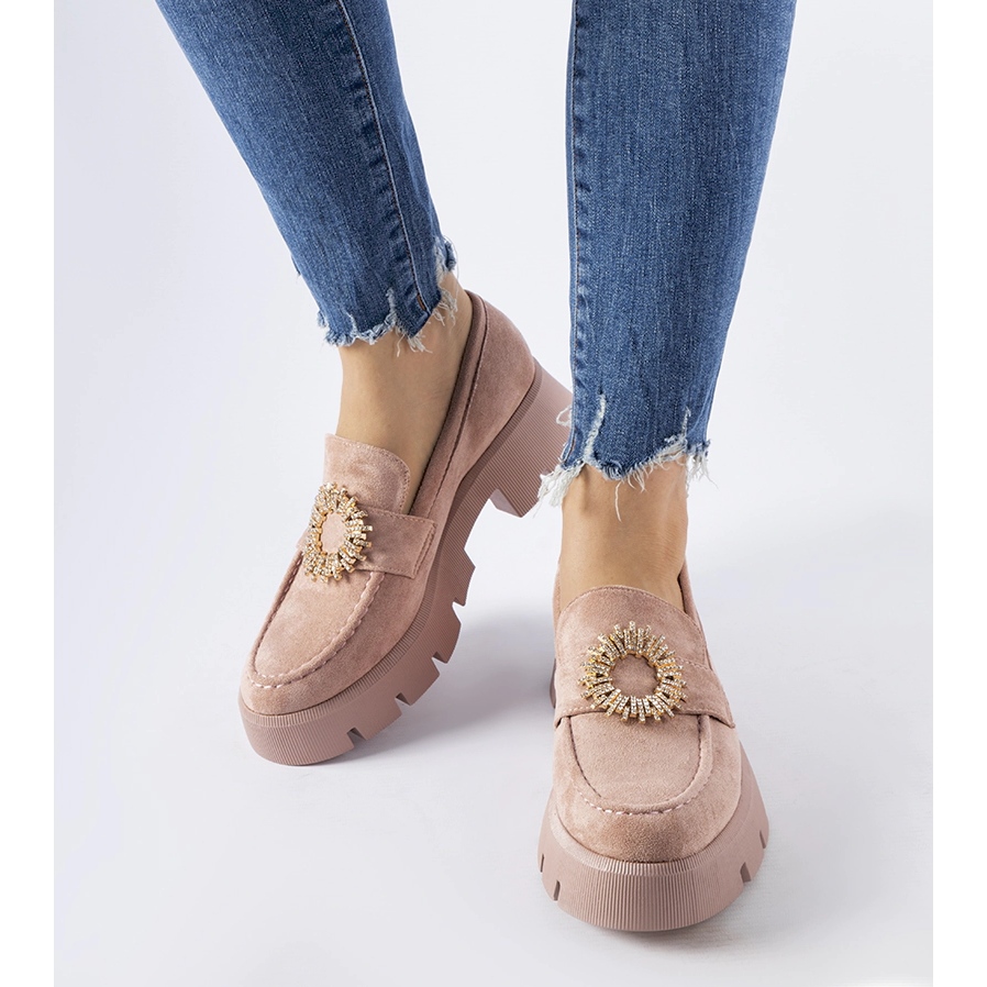 Rosa mockasiner dekorerade med ett Stanislas-spänne