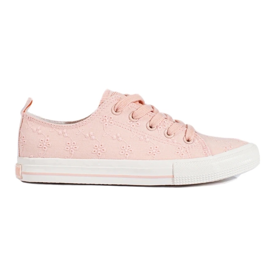 Delikata, feminina sneakers Big Star LL274224 i en nyans av blekrosa (L.Pink) är ett idealiskt förslag dagligen. Toppen som är helt gjord av textilier är dekorerad med ett subtilt blommönster och spetsar, tack vare vilken klassiska sportskärningar får en romantisk karaktär. Den låga 2,5 cm -plattformen och den mjukt byggda -i hälen ger komfort under dagen.