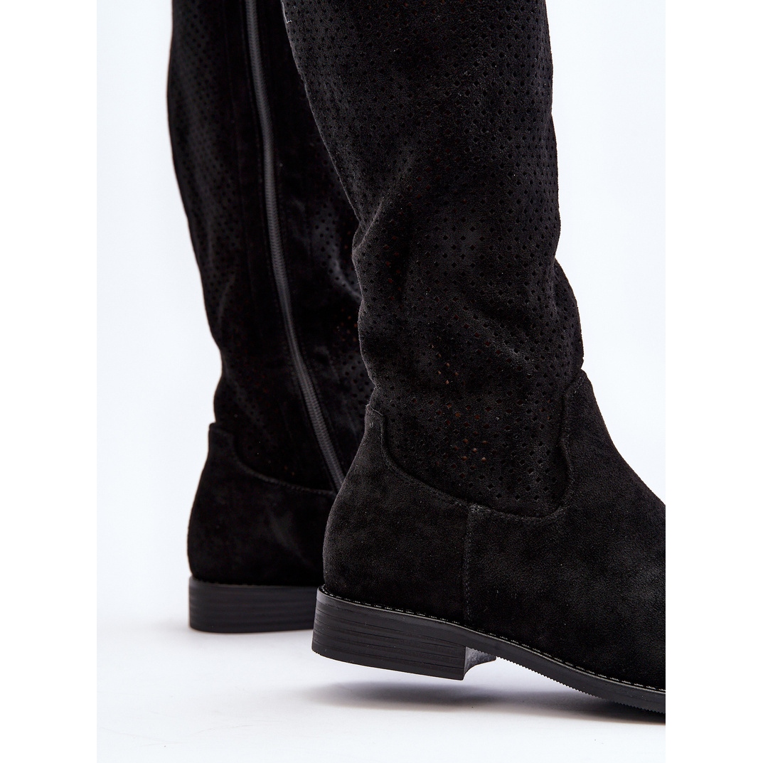 Stövlarna är gjorda av högkvalitativ eko-mocka, vilket gör dem inte bara eleganta, utan också miljövänliga. Deras genombrutna ovansida ovanför knäet lockar uppmärksamhet och lägger till lätthet och originalitet till alla kläder. Svarta S.Barski-stövlar från denna modell är en tidlös accessoar som passar många olika stilar.