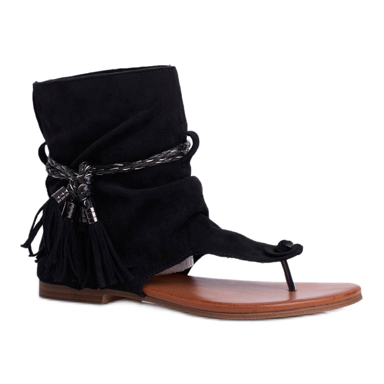 Dessa svarta flipflops med extra fransar är en perfekt kombination av klassisk stil och fashionabla accenter. De är gjorda av högkvalitativt ekologiskt mockaskinn och kommer att vara ett perfekt komplement till alla sommarstylingar. De har en platt klack 2 cm hög, vilket gör dem extremt bekväma även när de bärs länge.