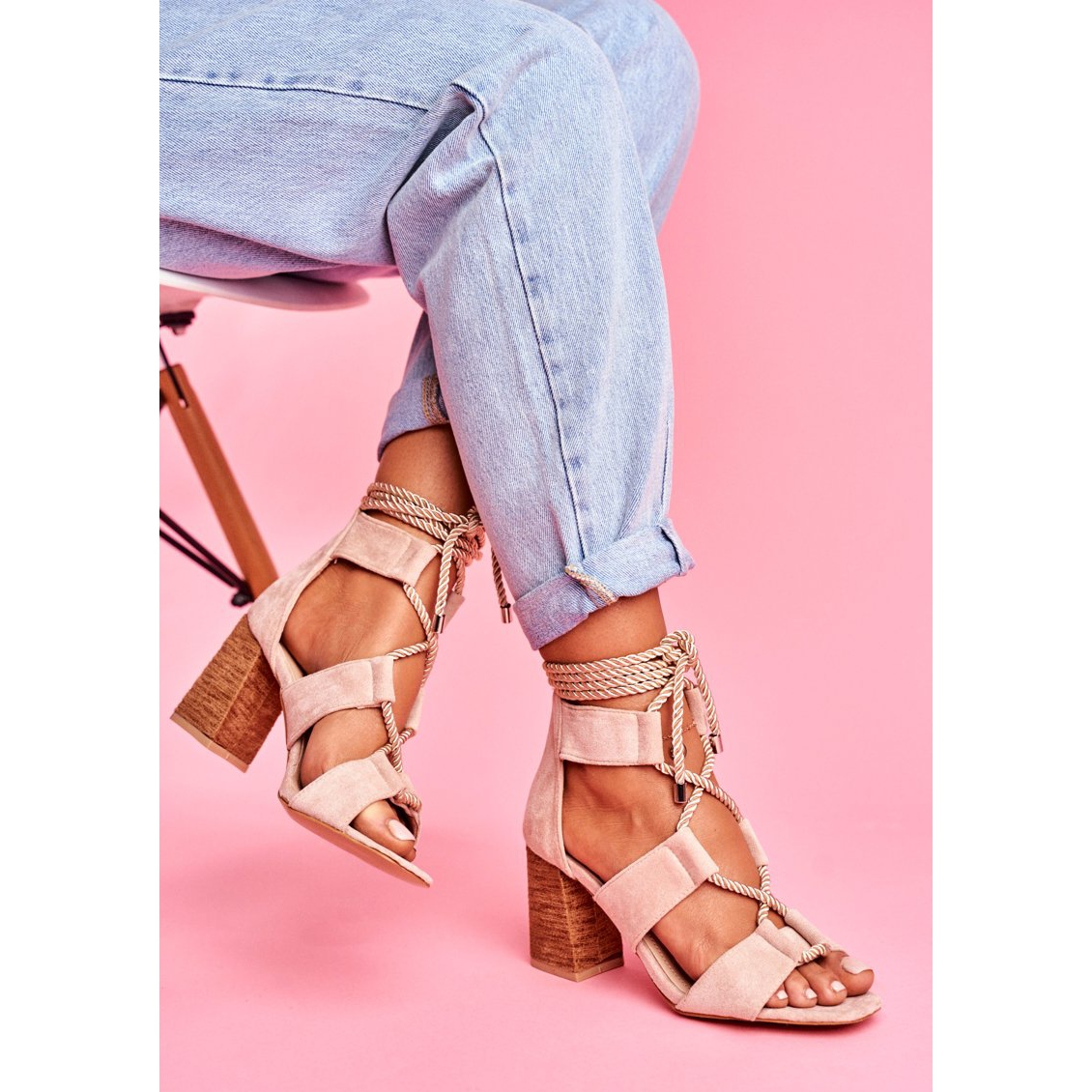 Sandalerna kännetecknas inte bara av sin ursprungliga design, utan också av en bekväm 8 cm hög blockklack. Spetsar som vackert sveper runt fotleden framhäver den feminina siluetten, och den fyrkantiga tån är i linje med de senaste trenderna. Denna modell är kvintessensen av klassiker i en modern version, vilket gör dem till en av de mest fashionabla accenterna för sommaren.