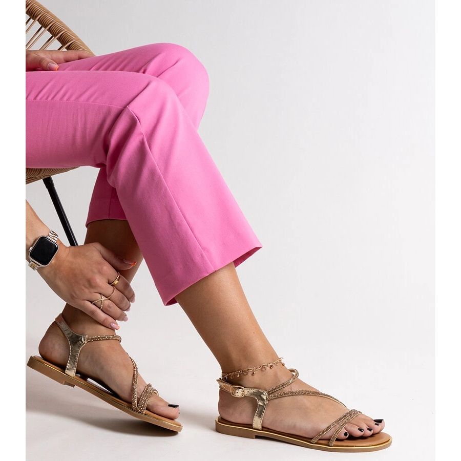 Gyllene sandaler dekorerade med Caramellas zirkoner är ett måste i sommar! Dessa eleganta, lätta plattplatta skor kombinerar komfort och fashionabla design som imponerar. Tack vare deras klassiska snitt kommer de perfekt att passa in i sommarstyliseringar, både för en promenad vid havet och för en sommarfest.