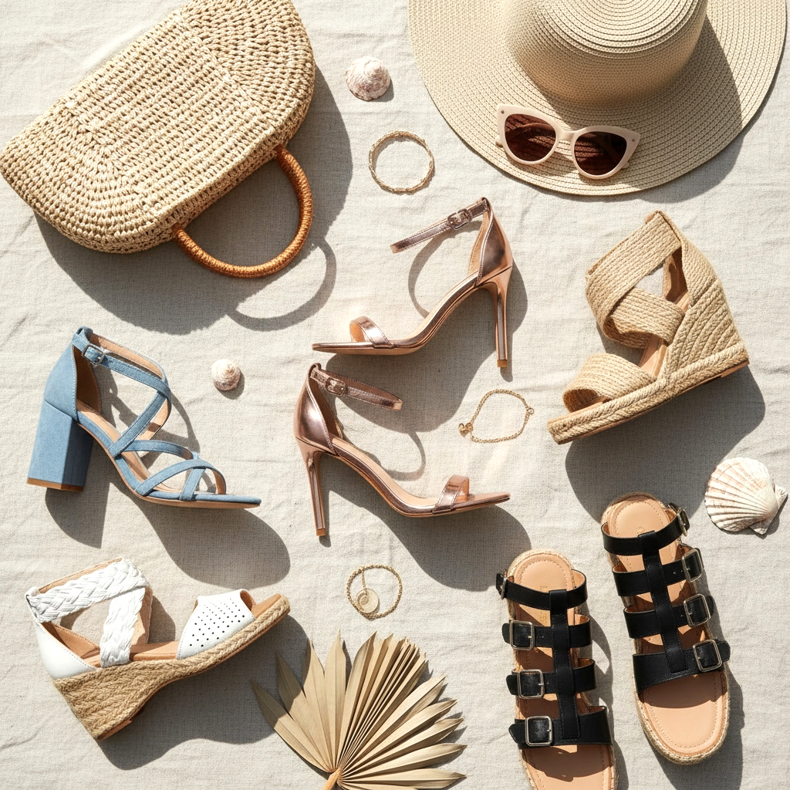 Platta sandaler med ankelrem är ett mer avslappnat alternativ, perfekt för jeansshorts, knälånga klänningar eller linnekjolar. För stranden och semestern: sandaler i korall, blått eller vitt med ankelrem och platt sula är ett bekvämt och stilrent val. För en musikfestival: sandaler med flera remmar, lite gladiatorstil, med jeansshorts och en bohoblus.