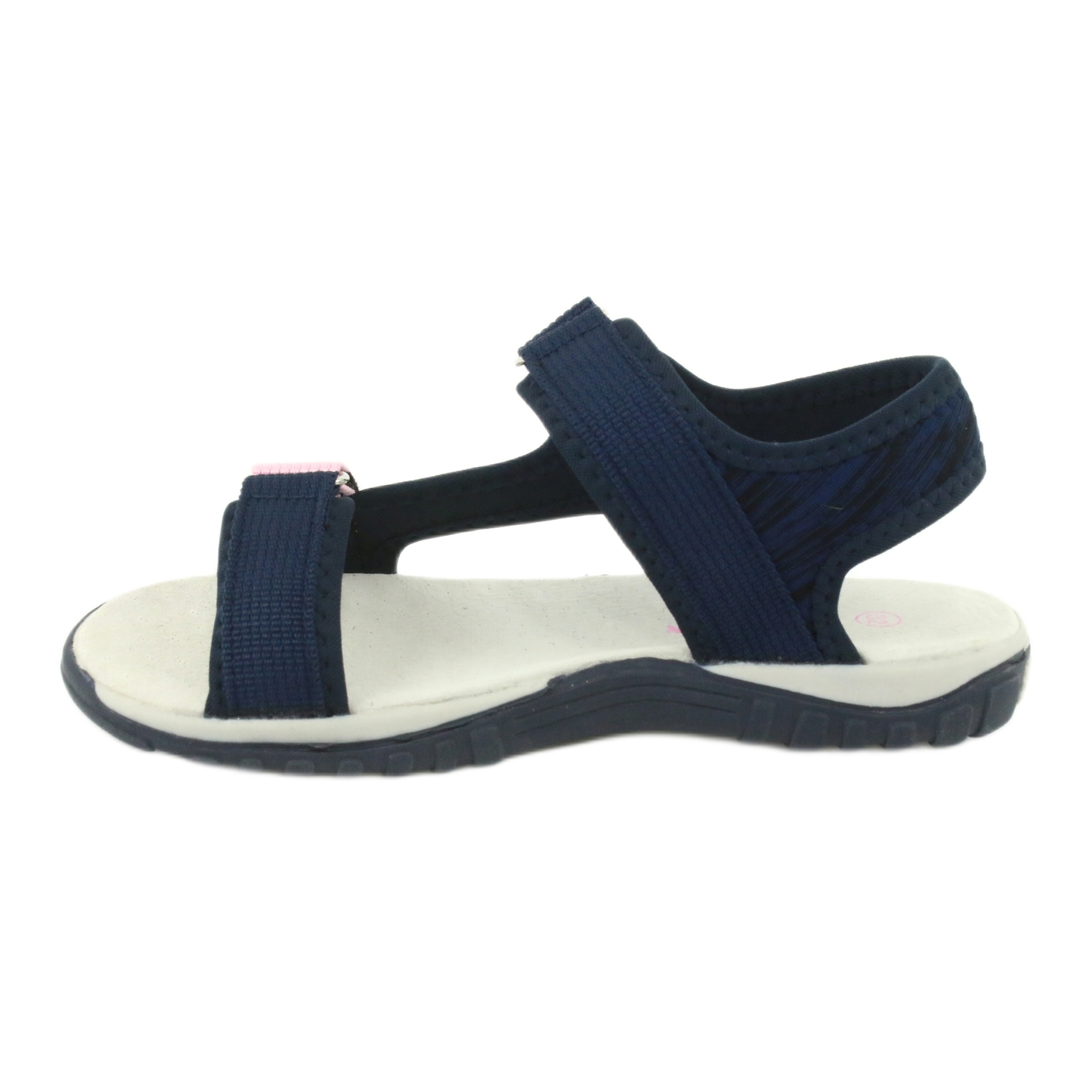 Sandalerna kännetecknas av sin intressanta stil och estetiska färger, som kombinerar marinblått med rosa accenter, vilket säkert kommer att tilltala varje tjej. Kardborreknäppning gör den lätt att ta av och på, samtidigt som den säkerställer ett stabilt fotfäste.