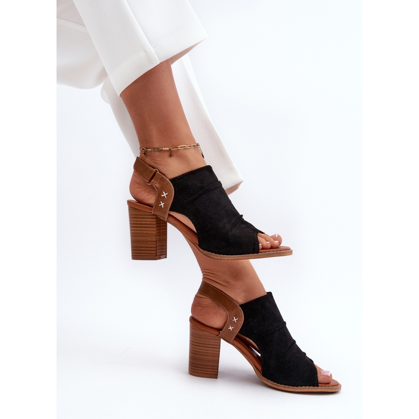 Sandaler är inbäddade på en solid häl i form av en stolpe, som är ansvarig för stabilitet och komfort att bära. Höjdhöjden på 8,5 cm betonar perfekt figuren, även om den inte belastar fötterna under ett långt slitage. Kardborrfäste gör det lättare att ta på sig och ta bort, vilket gör dessa sandaler till ett praktiskt val dagligen.