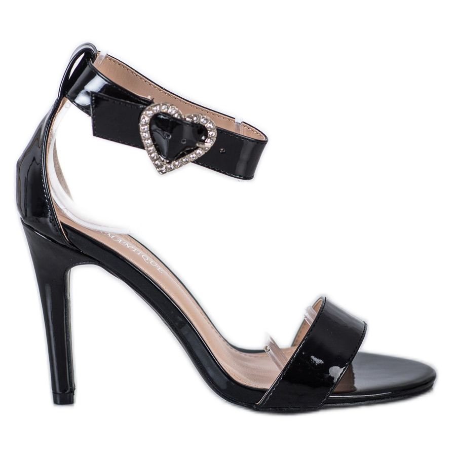 Dessa sandaler är gjorda av högkvalitativt läderimitation och har en subtil glans och deras eleganta design kompletteras med en dekorativ applicering av zirkoner. Den mörka färgen gör dem universella och passar många stilar, både klassiska och moderiktiga. Den syntetiska sulan med en slät struktur säkerställer stabilitet vid varje steg, och den ekologiska innersulan garanterar komfort vid användning.
