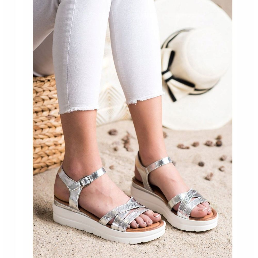Sandalerna är gjorda av högkvalitativt silvermaterial i läderimitation och njuter av dekorativ prägling av ett djurmotiv, vilket ger dem karaktär. Öppna tår och sammanvävda materialremsor gör foten bekvämare och ser samtidigt extremt snygg ut.