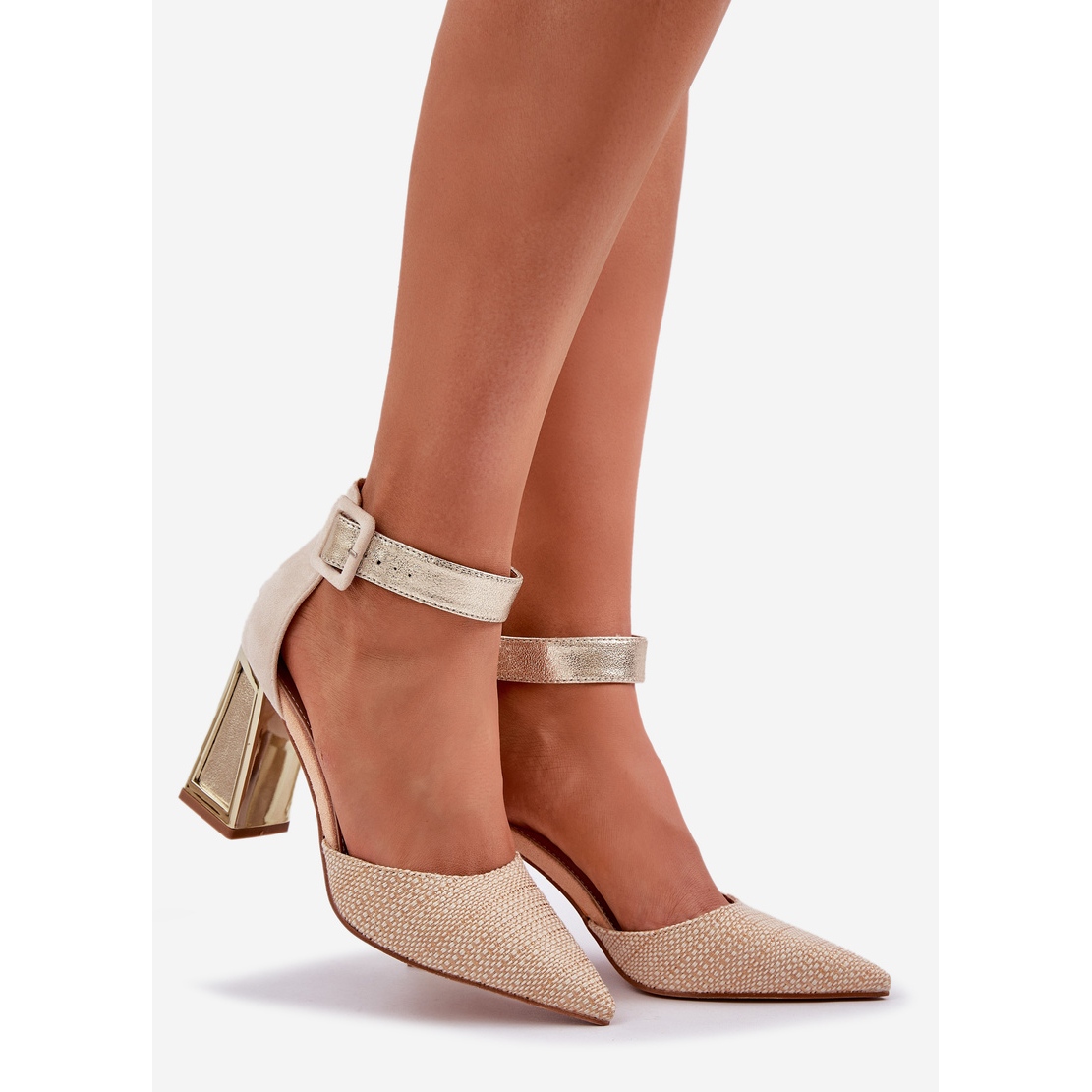 Sandaler på ett stolpe med spetsiga tår i en vacker gyllene färg är ett idealiskt förslag för kvinnor som vill betona deras unikhet och stil. Tillverkade av Eco Suede, de glädjer sig med en modern look och en elegant finish. En 9 cm hög klack med en spegelhöjd med en spegel, gyllene detalj ger dem en unik glöd, vilket gör varje stiliseringsförstärkning.