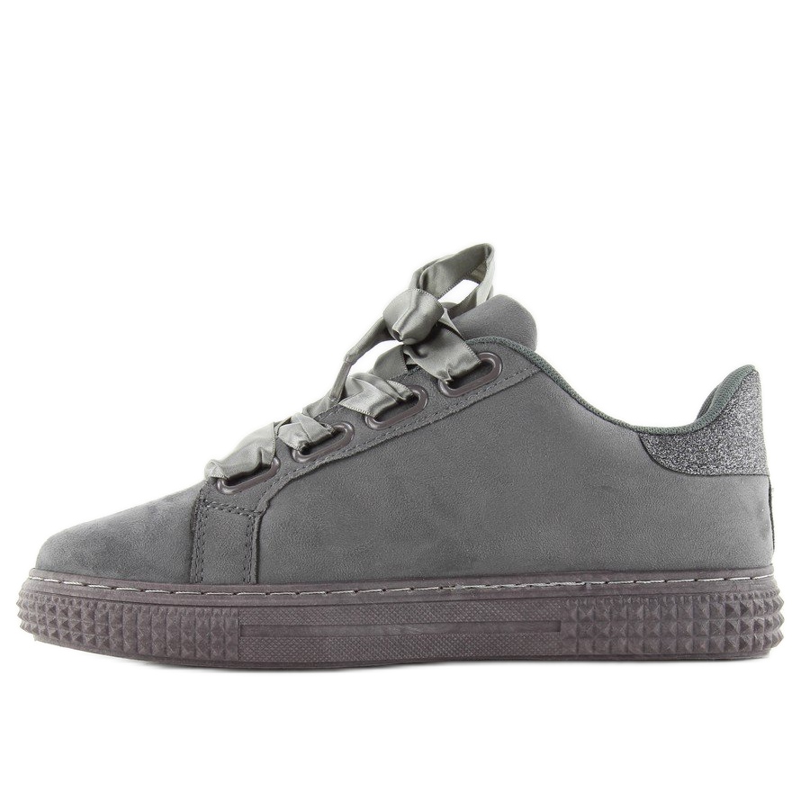 Vi presenterar snygga satinsneakers 16-535 i en elegant grå nyans. Dessa damskor är gjorda av mjuk, miljövänlig mocka och kombinerar moderiktig design med bekväm bärkomfort. Deras unika element är breda skosnören av satinband, som i kombination med dekorativa stenar på sidan av skon väcker uppmärksamhet och ger helheten en unik karaktär.