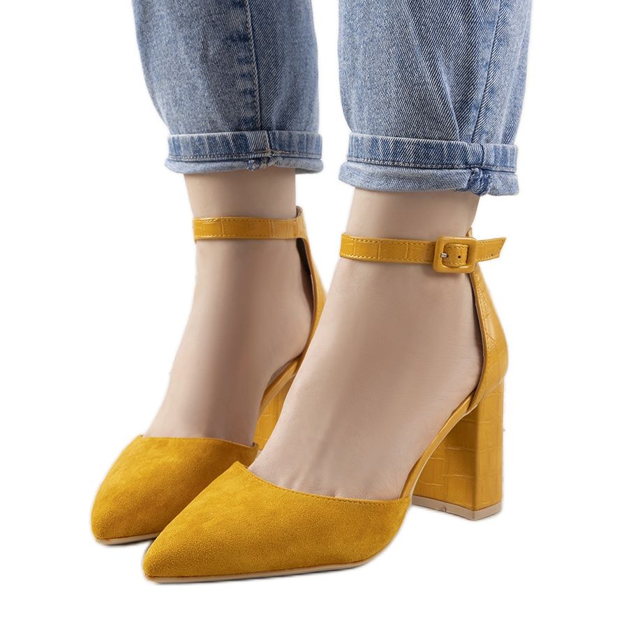 Natalie pumps i en vacker senapsgul nyans är ett viktigt tillskott till varje kvinnas garderob. De är gjorda av en kombination av ekologiskt läder och mocka och ser extremt snygga och fashionabla ut. Stängningen av ankelremmen tillför inte bara charm, utan säkerställer också stabilitet och komfort när den bärs.