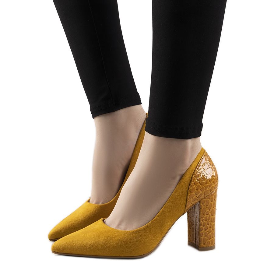 Baksidan av pumparna kännetecknas av en originalinsats gjord av ekologiskt patentläder med ett intressant motiv, vilket gör dem inte bara bekväma utan också moderiktiga. Den gula färgen med en distinkt beige sula är iögonfallande och livar upp även den mest dämpade outfiten.