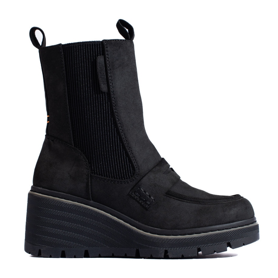 Eleganta, kvinnors svarta stövlar i svart - perfekt för svalare dagar. Modellen för vristen på en stabil 7 cm kil, gjord av ekologiskt läder med mocka struktur, med isolering och en praktisk blixtlås.