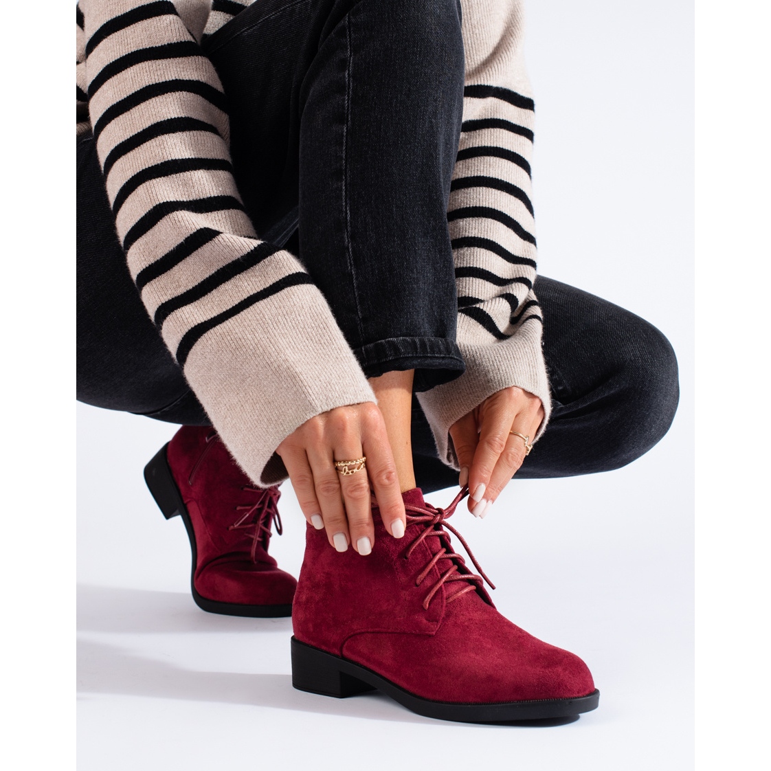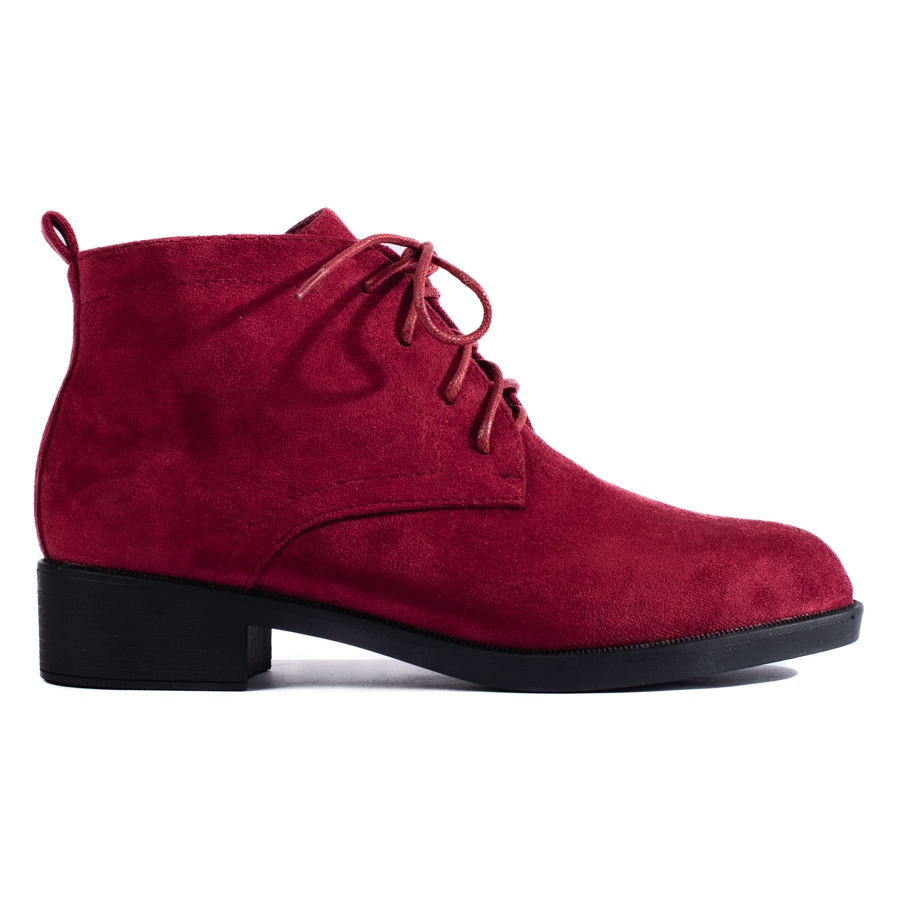 Detaljer: Shelovet ankelboots i vinröd mocka med snörning