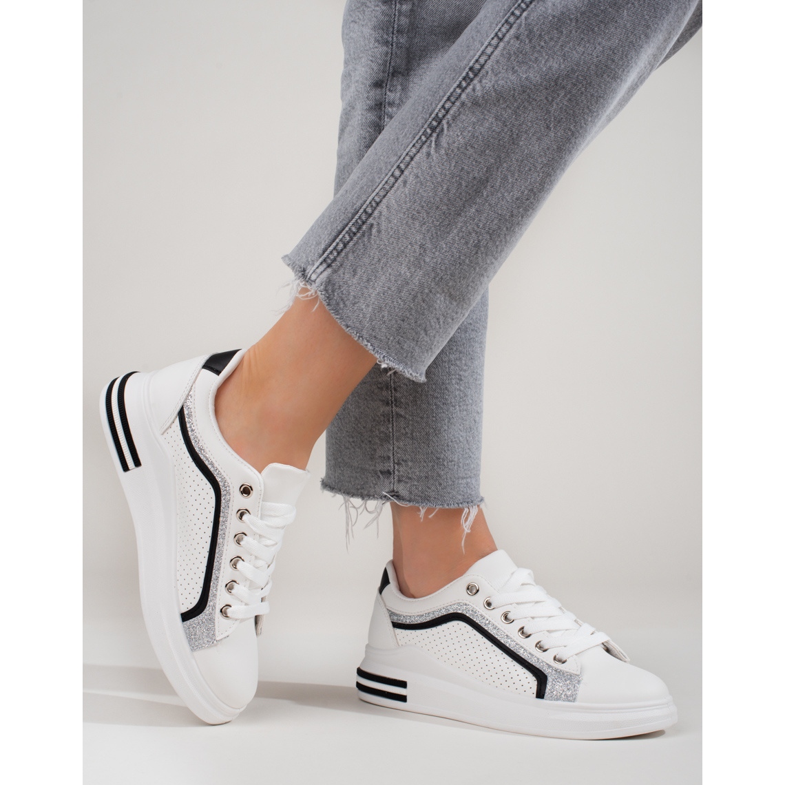 ⭐ **Hög plattform**, 4 cm hög, höjer fötterna, vilket har en positiv effekt på figuren och samtidigt säkerställer komforten att bära. Sneakersna är gjorda av högkvalitativt eko-läder, vilket inte bara ger dem ett elegant utseende, utan också gör dem lätta att sköta. En mjuk, inbyggd häl säkerställer dessutom bärkomfort, och den runda tån ger en klassisk look.