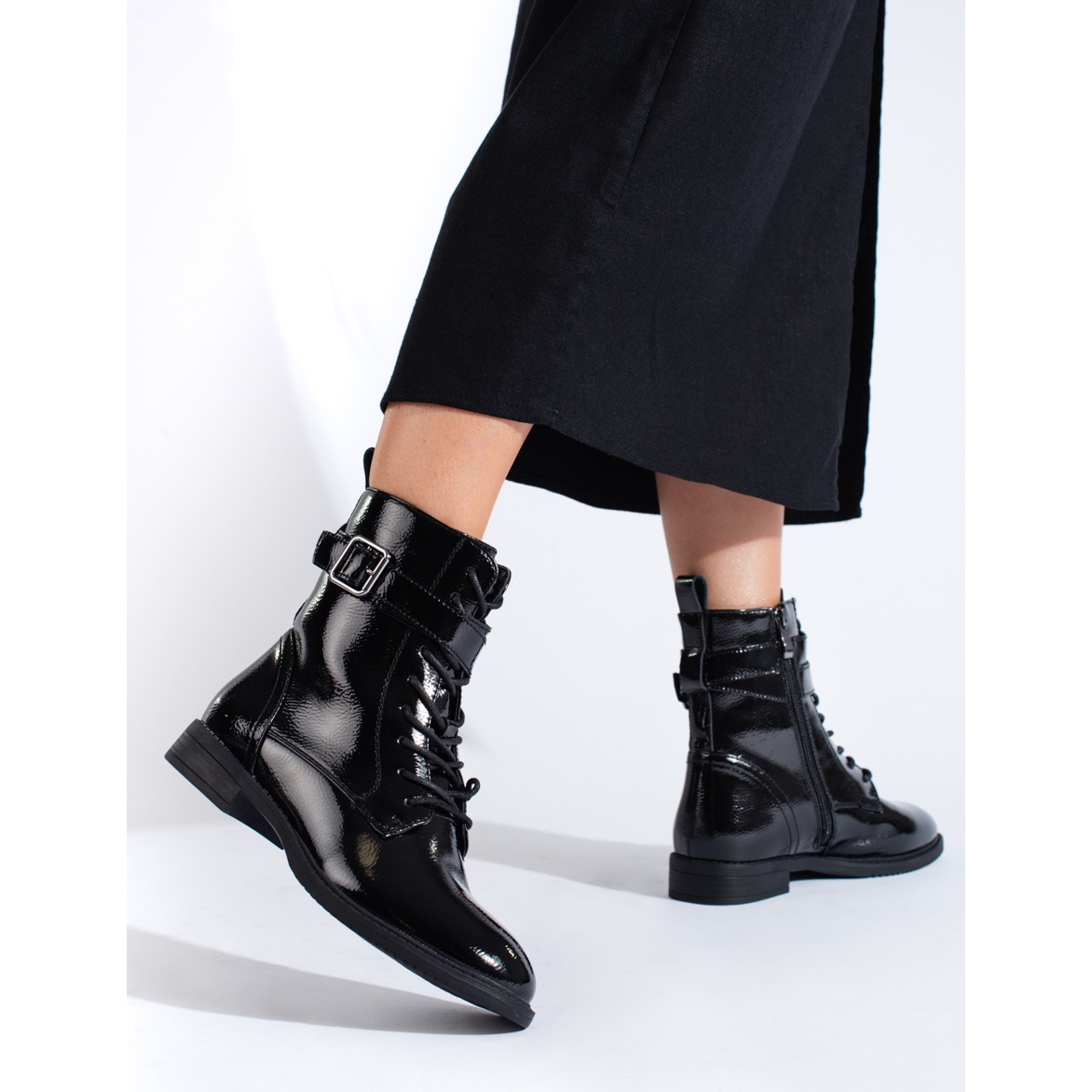 Svartlackerade Shelovet-arbetare är ett förslag för kvinnor som värdesätter kombinationen av avslappnad stil med en rockkaraktär. Dessa solida stövlar är ett måste i garderoben för alla älskare av uttrycksfulla accessoarer som inte är rädda för att betona sin individualism och passion för en icke-konform look.