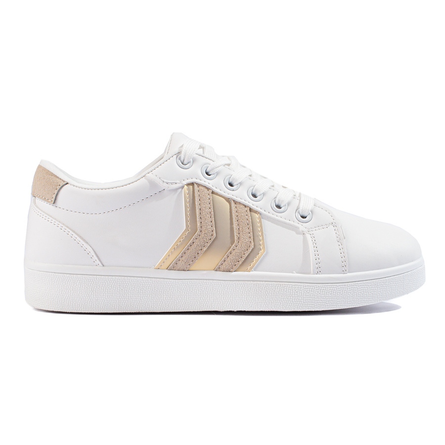 Plastsulan, utrustad med slitbana, säkerställer god vidhäftning mot underlaget, vilket är särskilt viktigt under omväxlande vår- och sommarväder. Den mönsterlösa, rent vita designen med diskreta beige och guldiga accessoarer gör skorna lätta att kombinera med många klädesplagg, både jeans och sportklänningar.