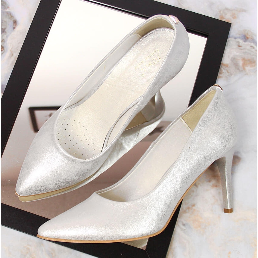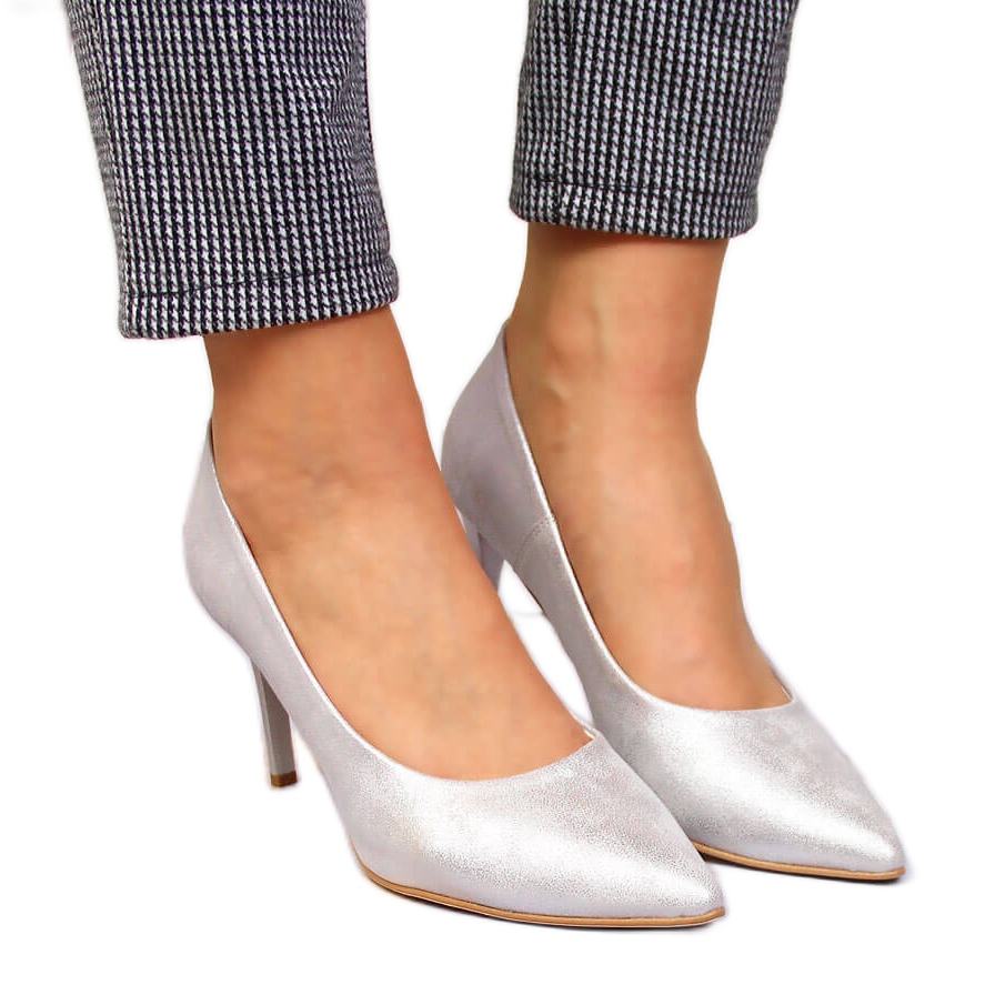 Den silverfärgade och eleganta designen gör dessa skor perfekta för både vardagliga, vardagliga outfits och mer formella tillfällen. En hög, smal 8,5 cm klack ger femininitet och förlänger figuren, och slip-on-knäppningen gör den lätt att ta på. Denna modell, utan mönster, kännetecknas av en minimalistisk design som säkert kommer att tilltala alla fans av modernt mode.