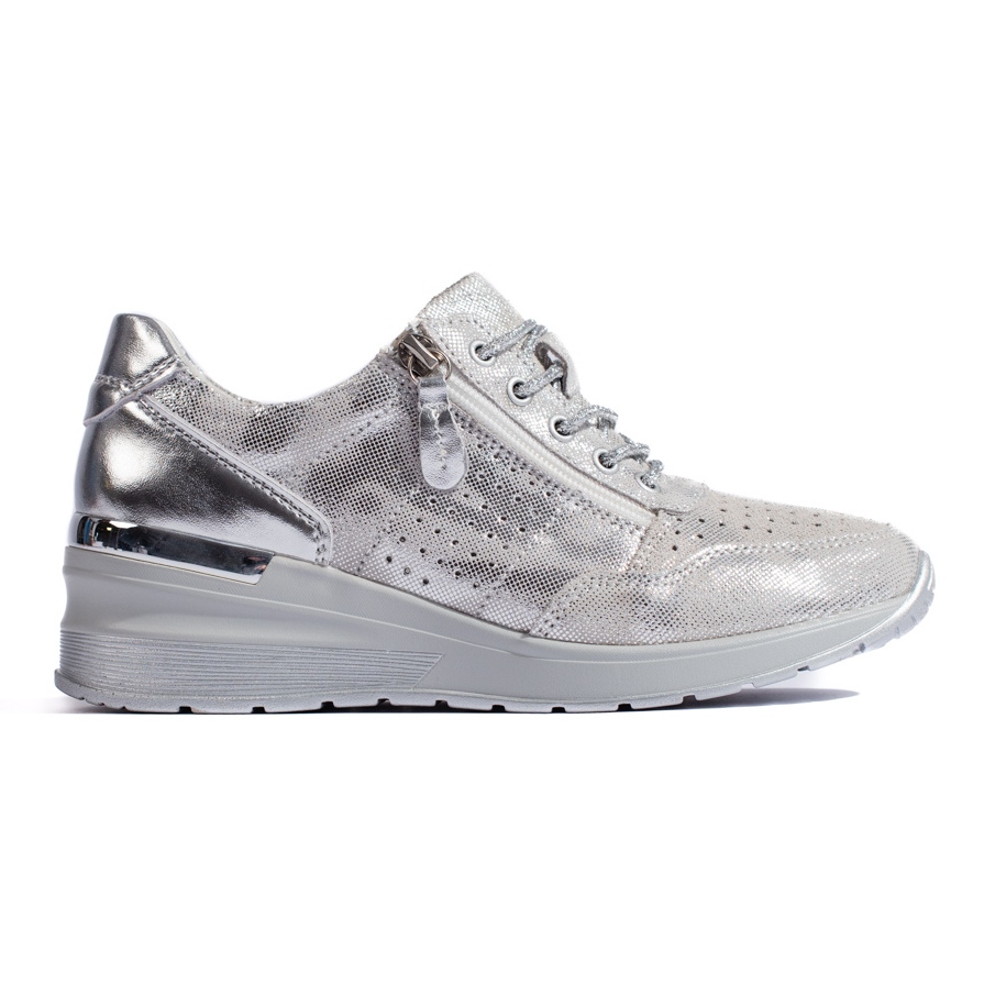 Upptäck unika läder wedge sneakers i en extremt fashionabel silverfärg, perfekt för varje modern kvinna! Dessa snygga skor, producerade av varumärket Inna Marka, kombinerar elegans och en sportig karaktär, vilket gör dem perfekta för vardagsstyling.